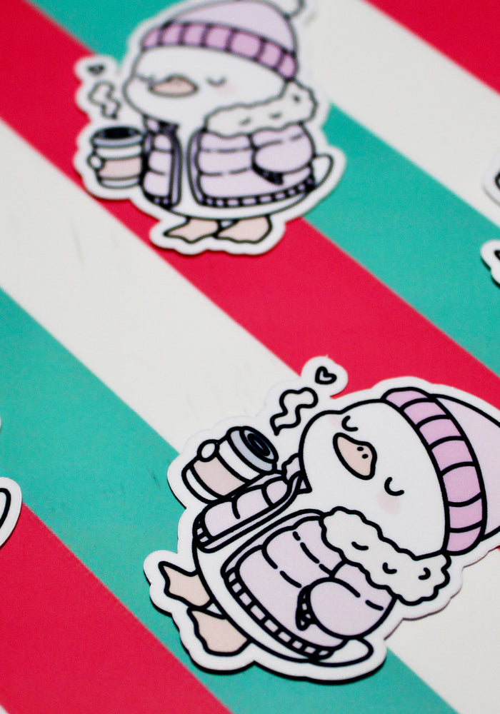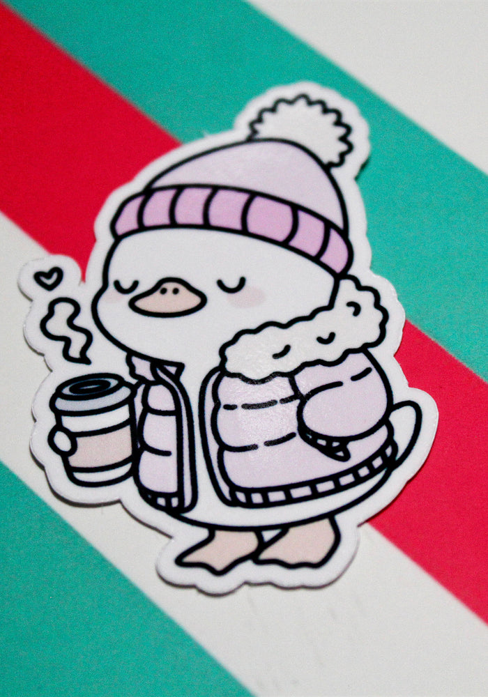 Cute Winter Duck Pink Coat Sticker – Cozy Duck in Puffer Coat – Hot Drink Duck Vinyl Sticker – Waterproof Glossy Sticker – Pastel Winter Aesthetic – 3.76cm x 5.48cm