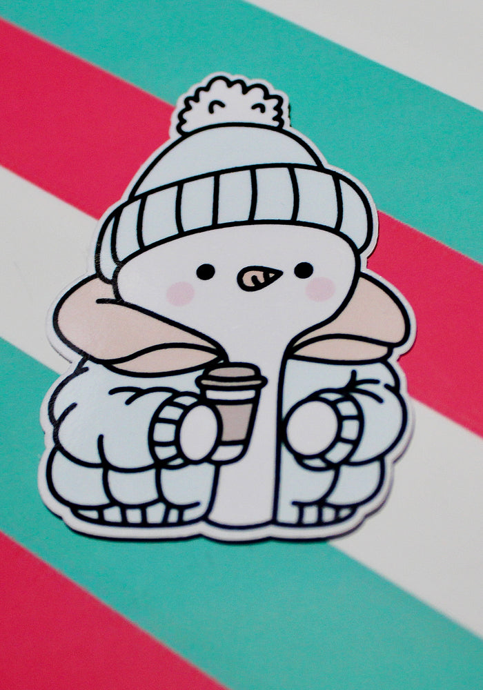 Cozy Winter Snowman Blue and Yellow Coat Sticker – Cute Snowman Vinyl Sticker – Hot Drink Snowman – Glossy Waterproof Sticker – Winter Aesthetic – 4.25cm x 6.18cm