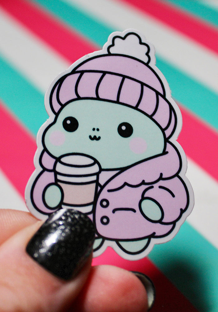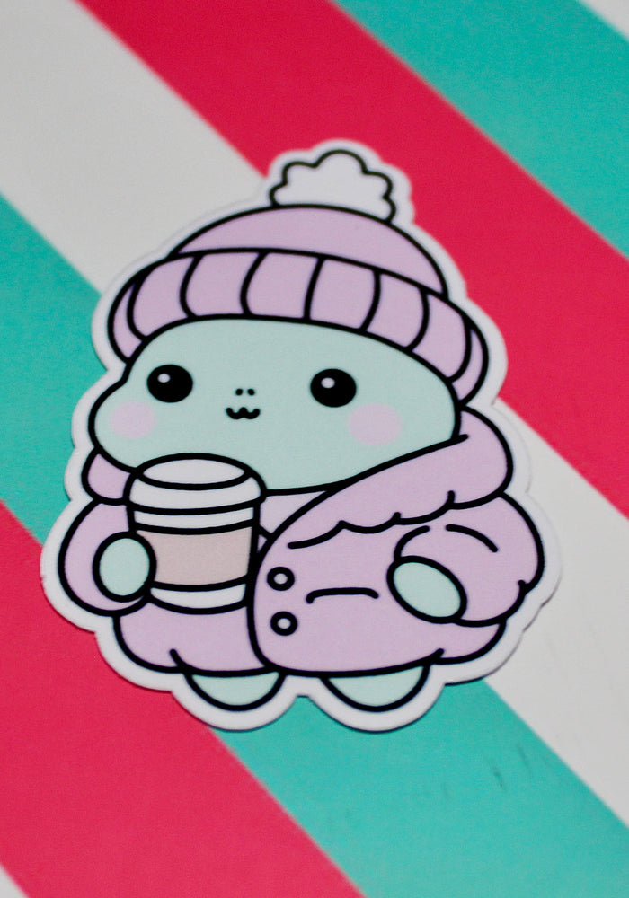 Winter Frog Pink Coat Sticker – Cute Pastel Cosy Aesthetic - Hot Drink Frog Vinyl Sticker - Gloss Waterproof - 3.99cm x 5.6cm