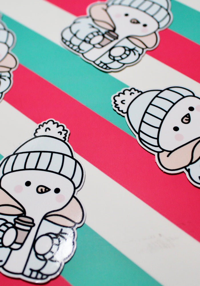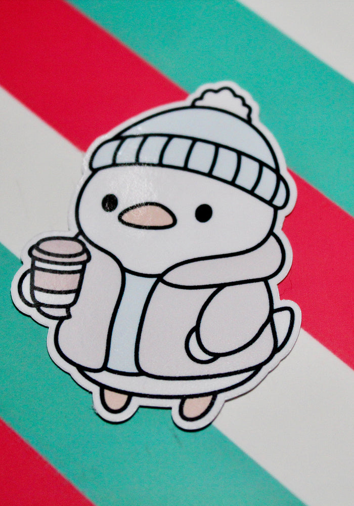 Winter Duck Blue Coat Sticker – Cute Pastel Cosy Aesthetic - Hot Drink Duck Vinyl Sticker - Gloss Waterproof - 4.04cm x 5.56cm
