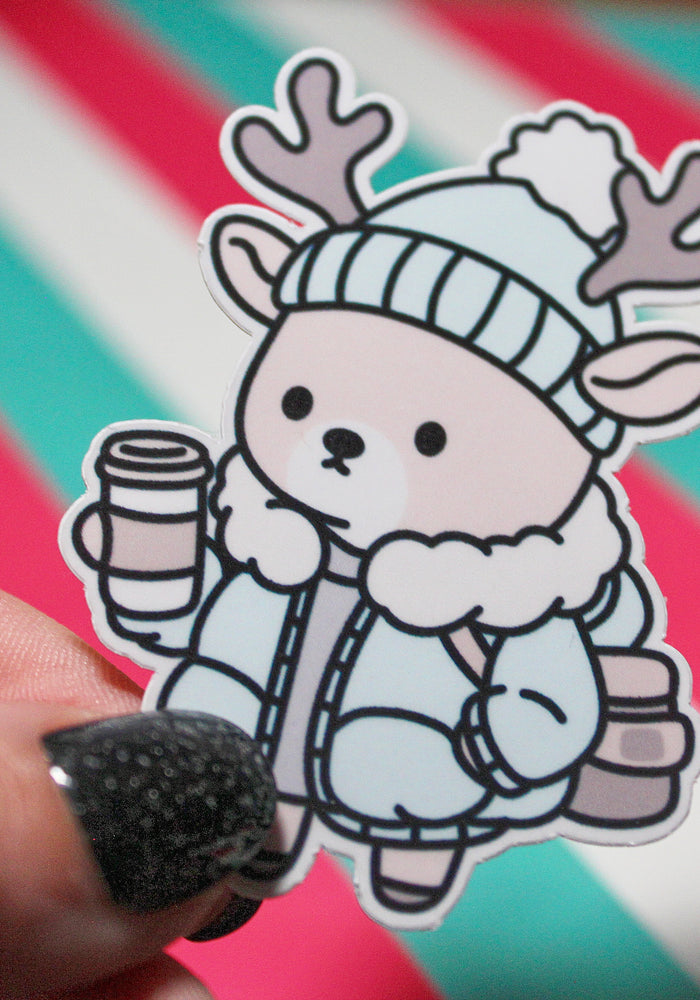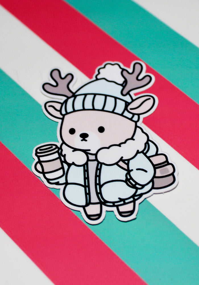 Cosy Winter Reindeer Sticker – Cute Pastel Aesthetic | Hot Drink Christmas Sticker | Waterproof Gloss Vinyl | 4.41cm x 5.98cm