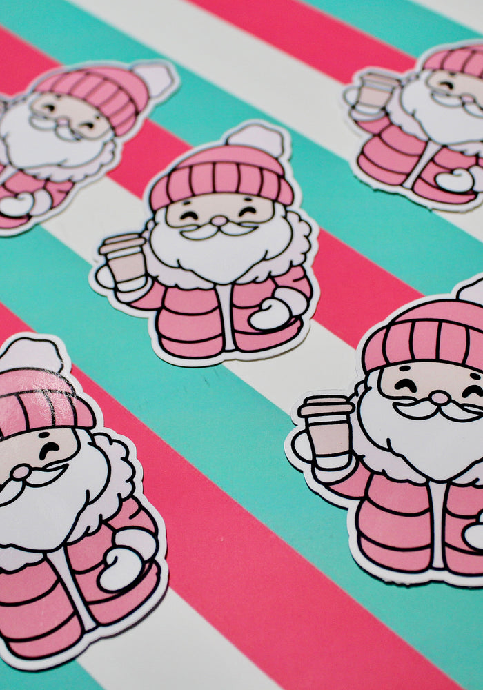 Red Cozy Santa Sticker – Cute Christmas Santa Vinyl Sticker – Hot Drink Santa – Glossy Waterproof Sticker – Festive Aesthetic – 4.67cm x 6.32cm