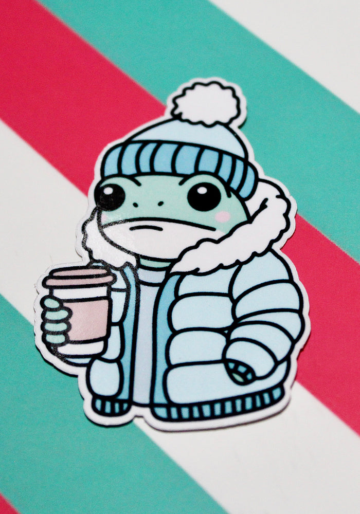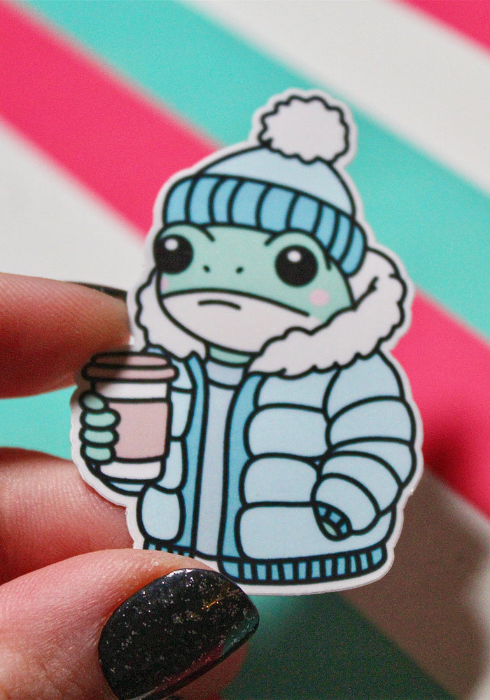 Cute Winter Frog Blue Coat Sticker – Cozy Frog in Puffer Jacket – Frog with Hot Drink – Glossy Waterproof Vinyl Sticker – Pastel Winter Aesthetic – 3.64cm x 5.5cm