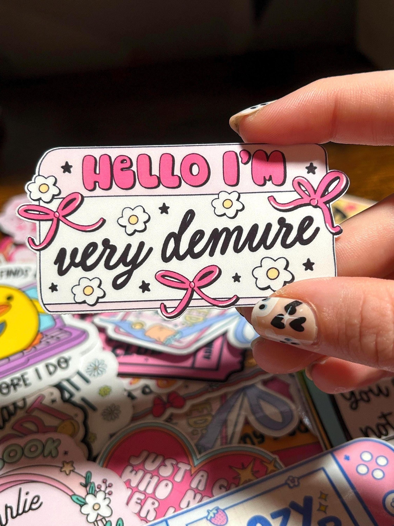 • Hello I’m Very Demure Sticker | Cute Bow Aesthetic Sticker | Feminine Coquette Name Tag | Gloss Vinyl | Stick With Geo