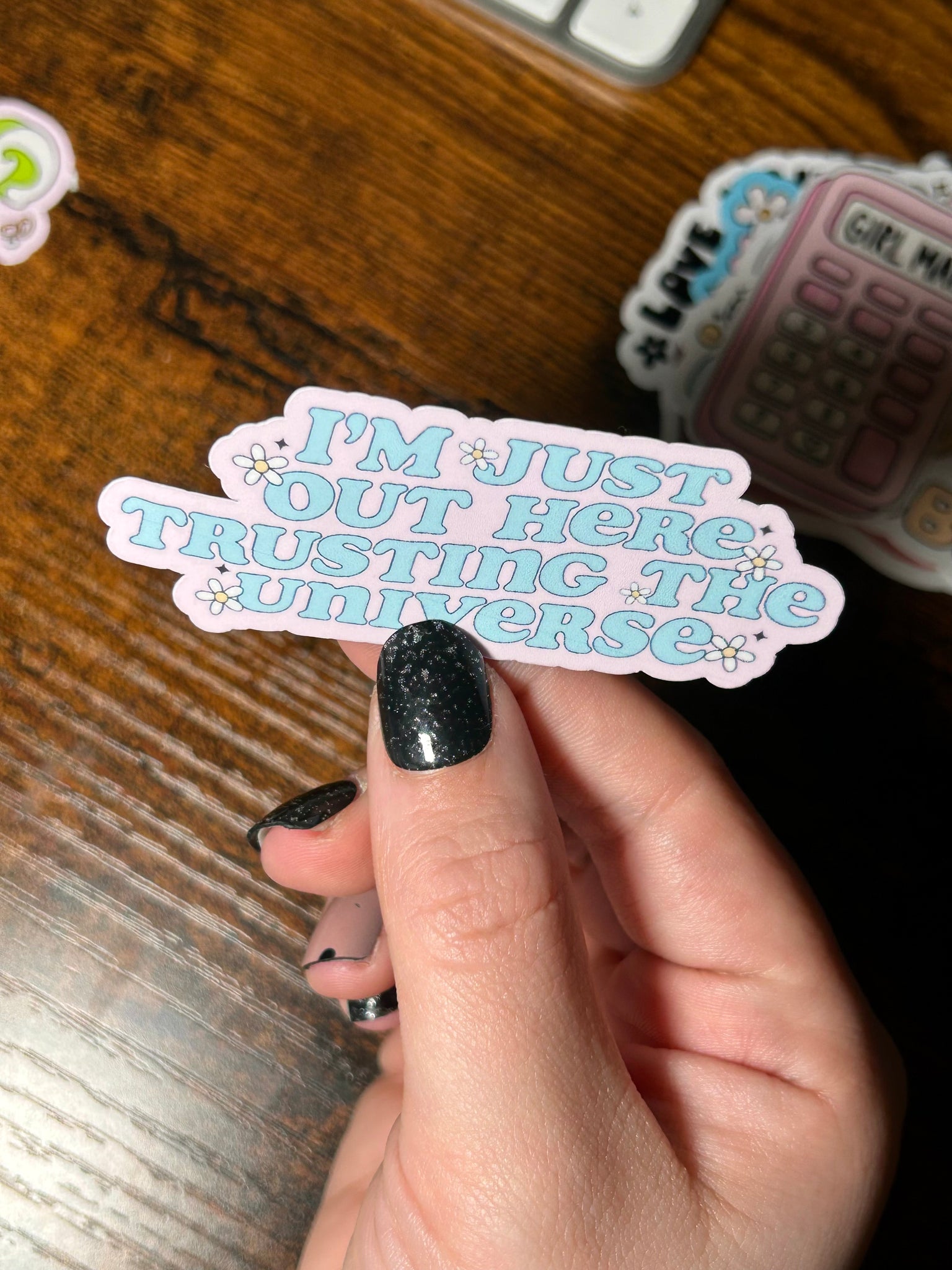 This pastel blue “I’m Just Out Here Trusting the Universe” sticker is the perfect little reminder to let go, have faith, and stay positive. Designed in a retro-style font with dainty flowers, it adds instant good vibes to your laptop, journal, or water bottle.