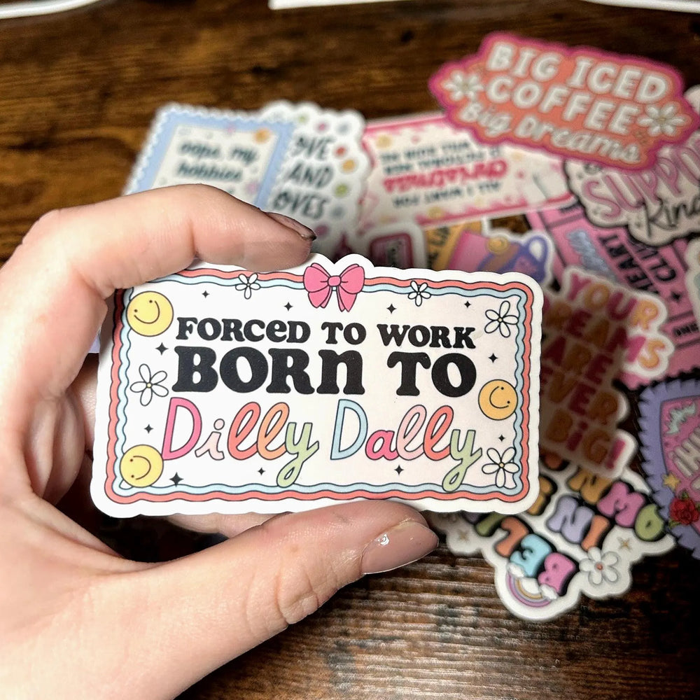 Funny 'Dilly Dally' Glossy Vinyl Sticker: Retro Laptop, Journal Decal