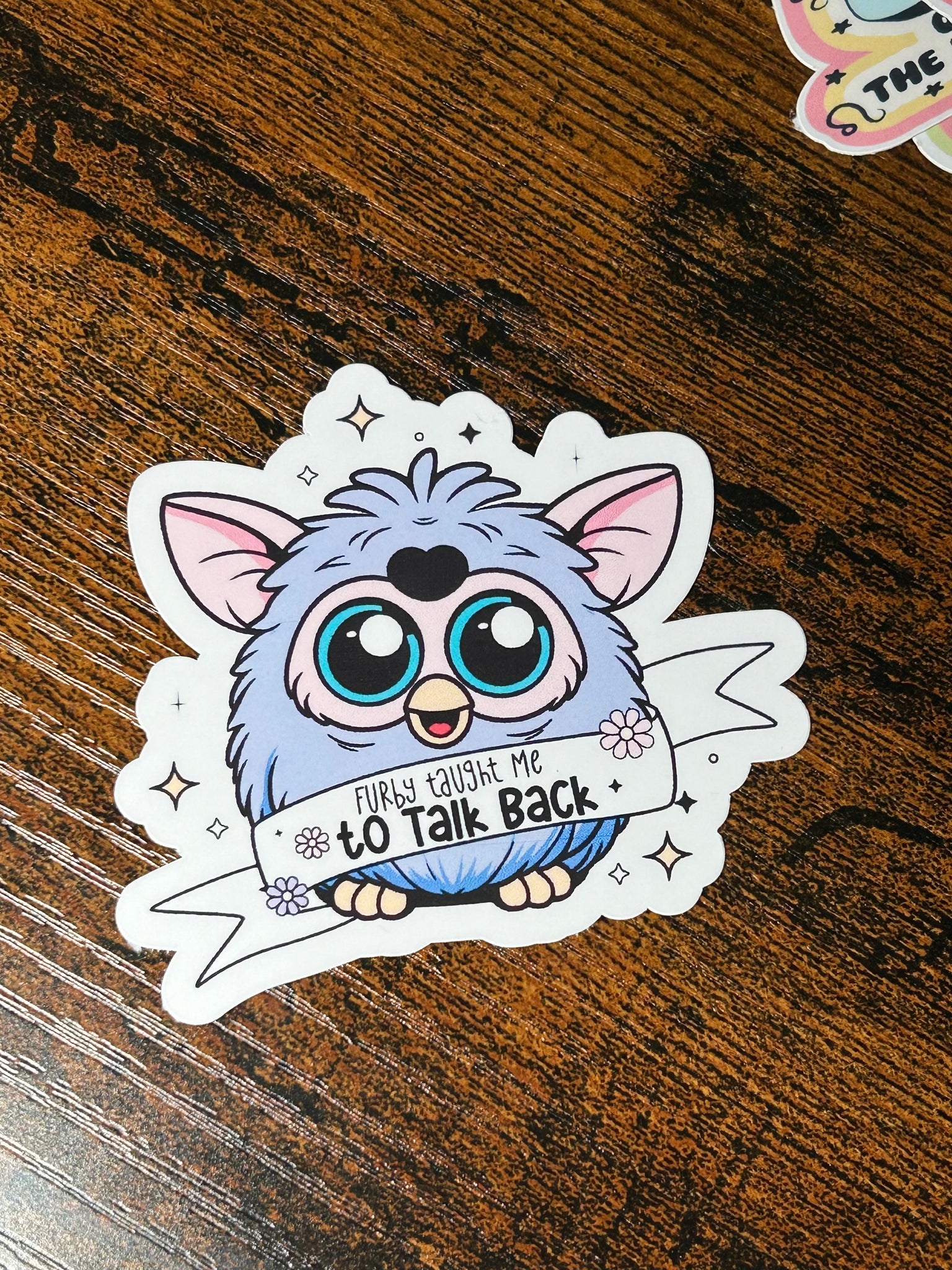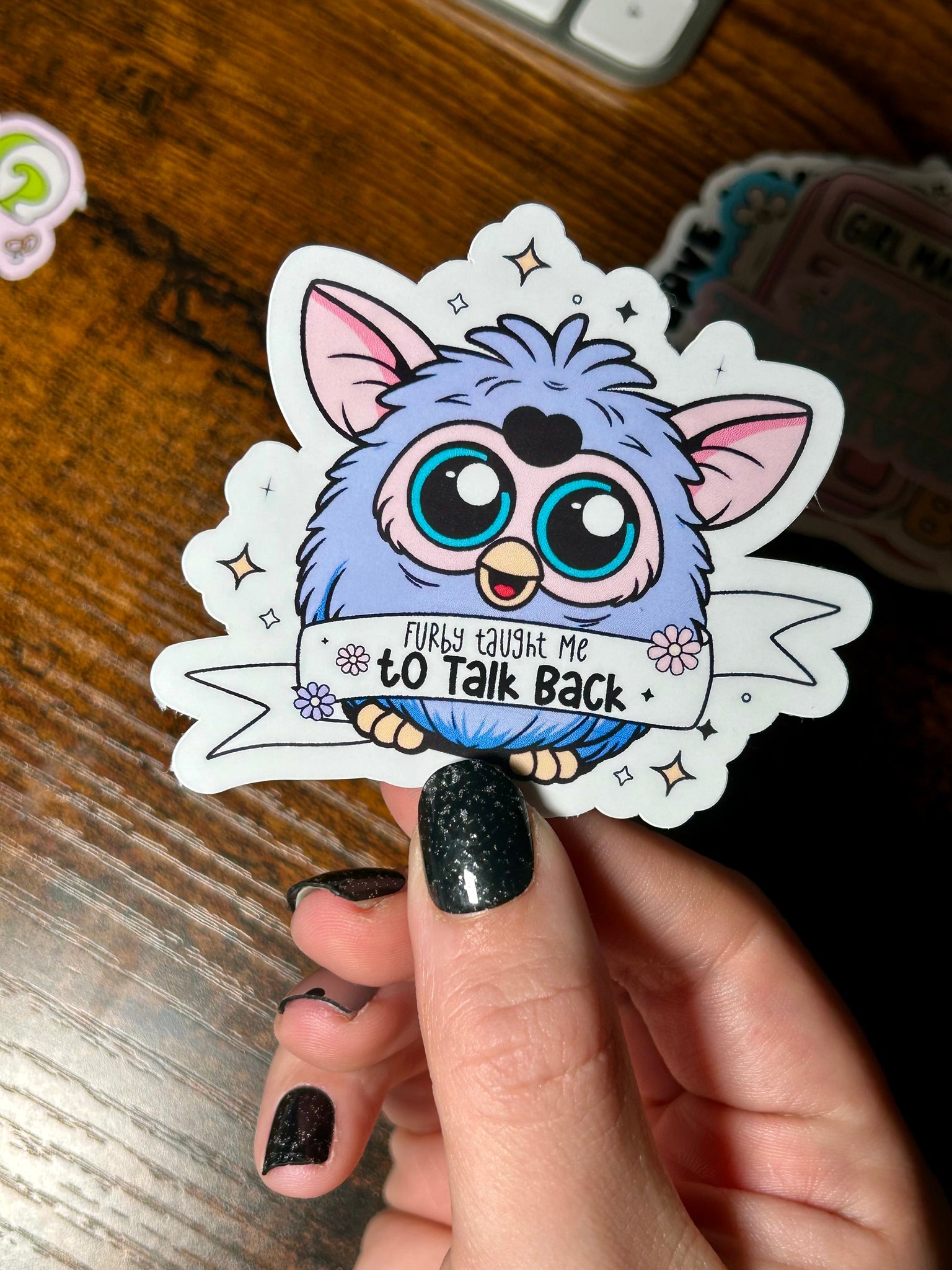 This adorable and sassy “Furby Taught Me To Talk Back” sticker mixes childhood nostalgia with a cheeky modern twist. Featuring a cute pastel Furby-inspired design with big sparkly eyes and a retro banner, it’s perfect for your laptop, journal, or water bottle.