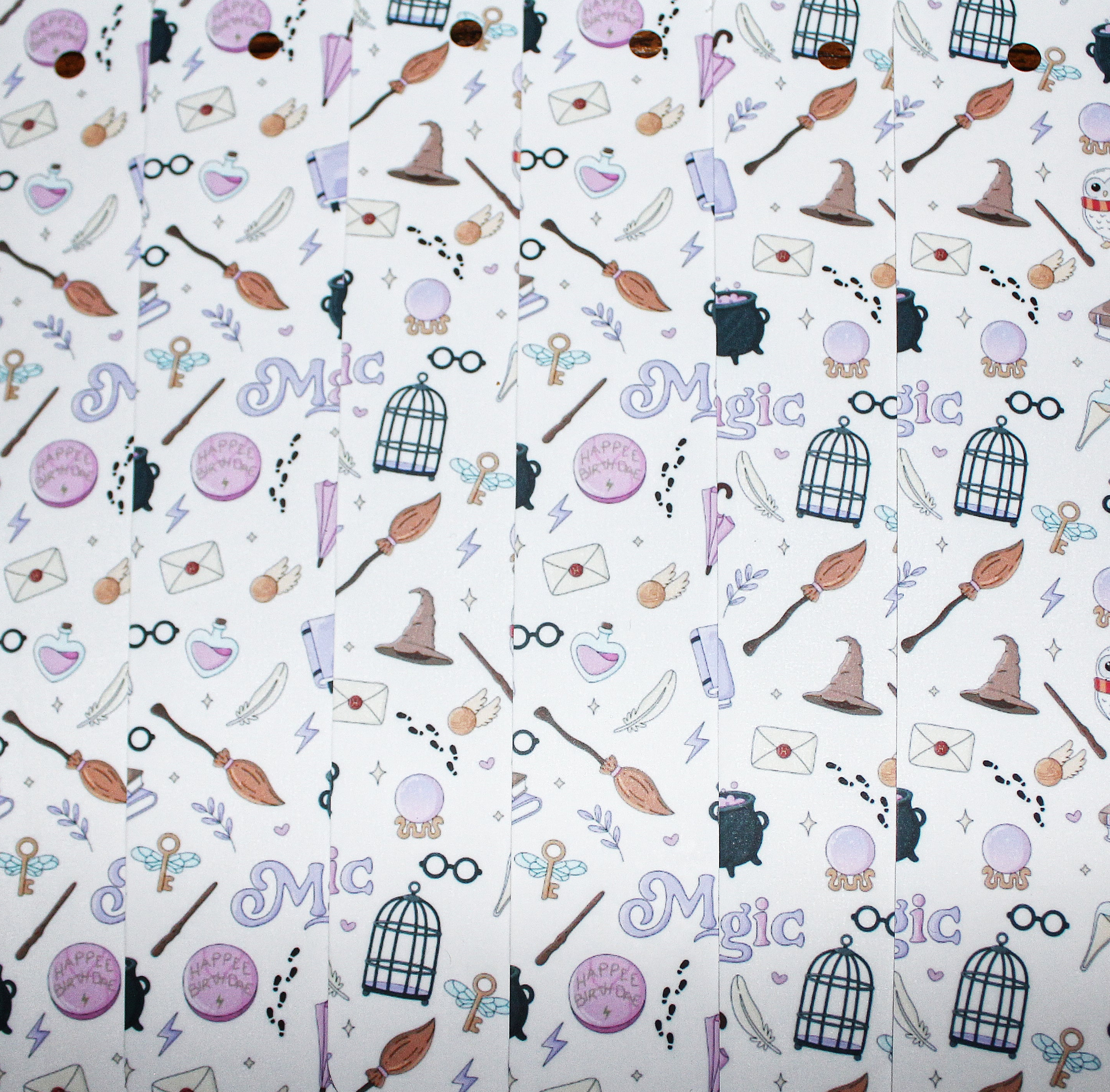 Decorated with adorable fantasy elements — broomsticks, spellbooks, glasses, owls, envelopes, potions, wands and more — this design is perfect for fans of magical adventures.