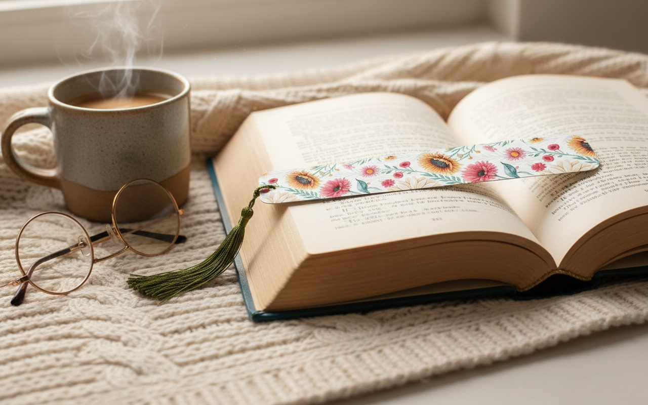 • Open book with a floral bookmark, mug of coffee, and glasses on a textured surface.