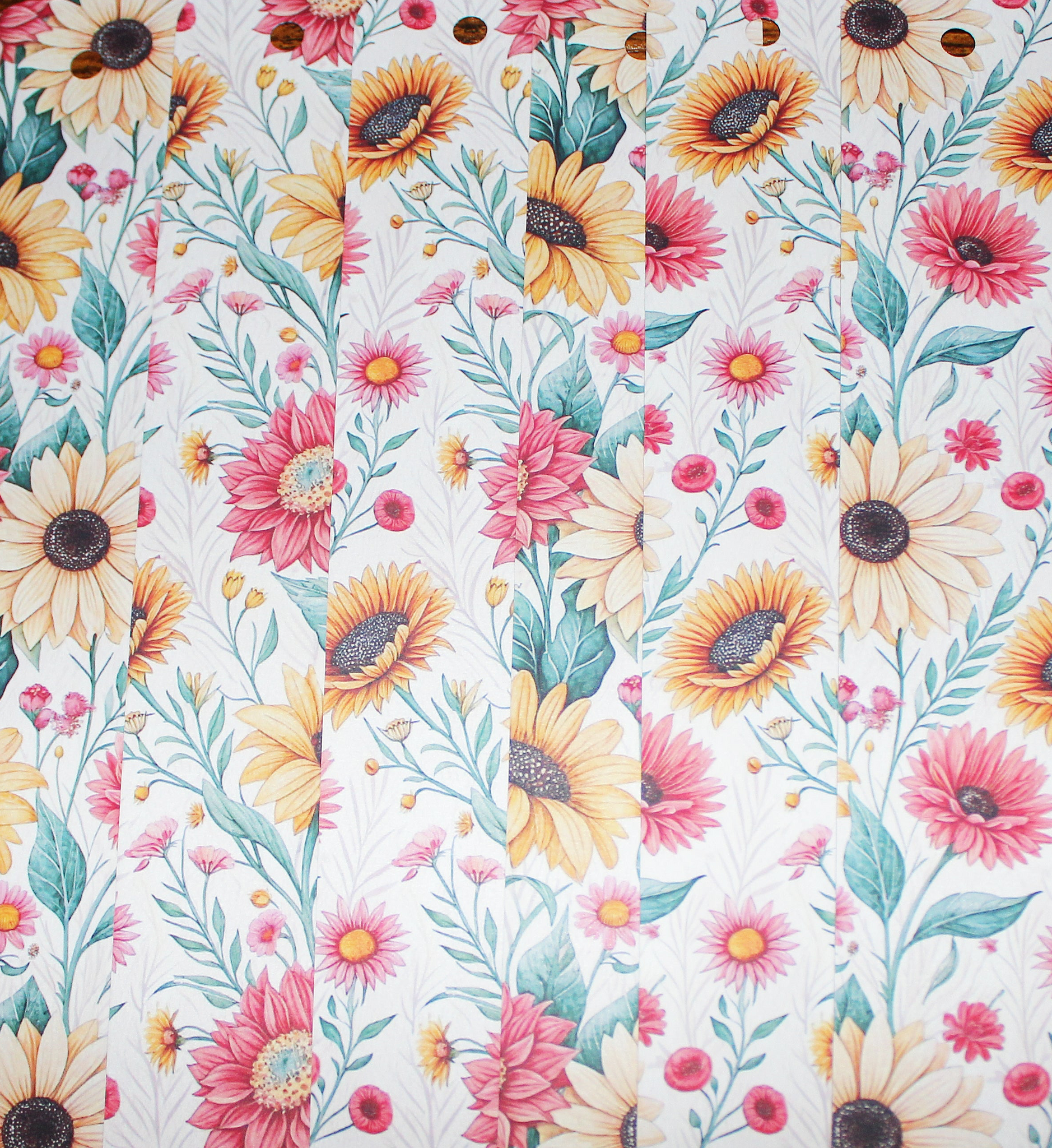 Covered in bright yellow sunflowers, pink and red blooms and soft greenery, this design feels happy, warm and perfect for spring and summer reading.