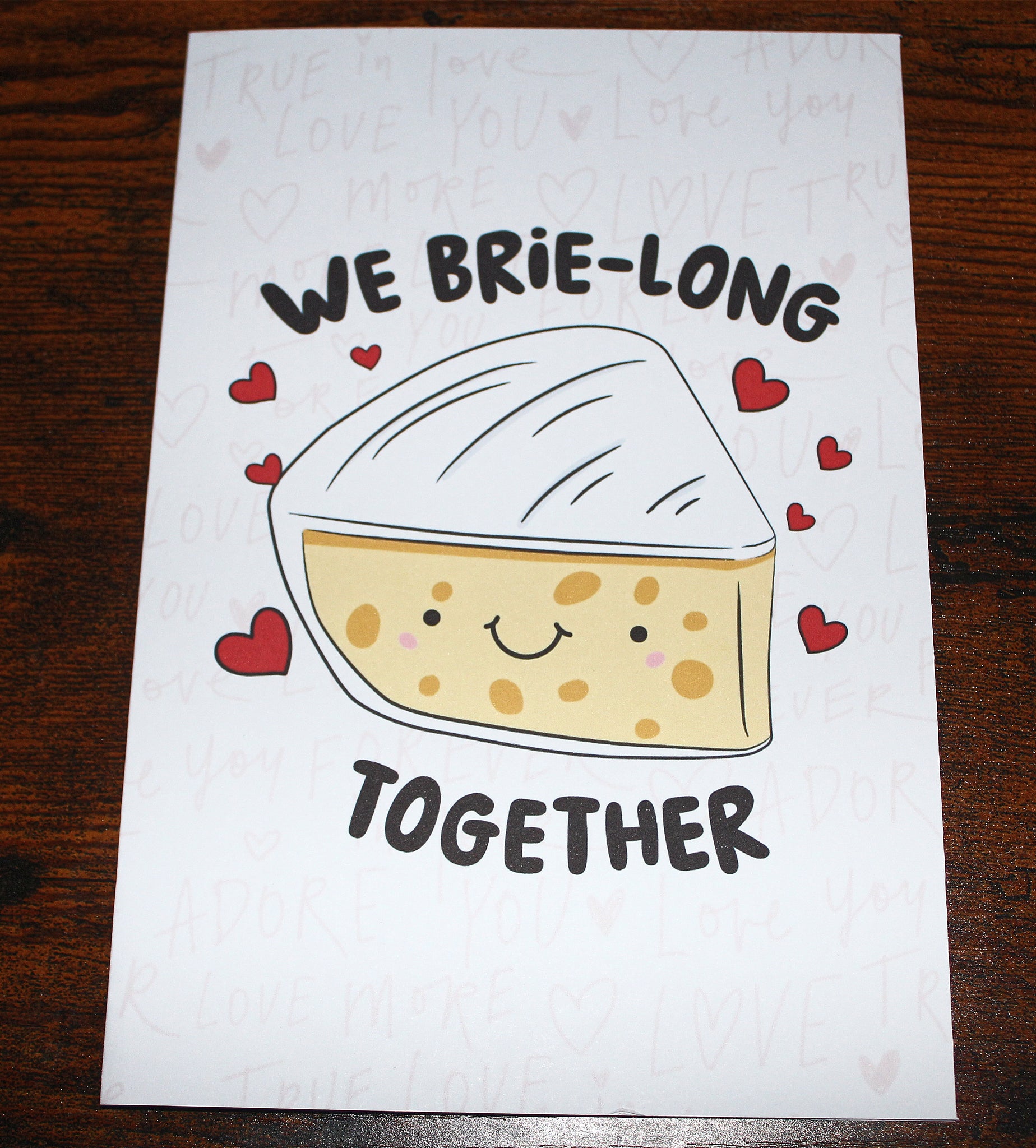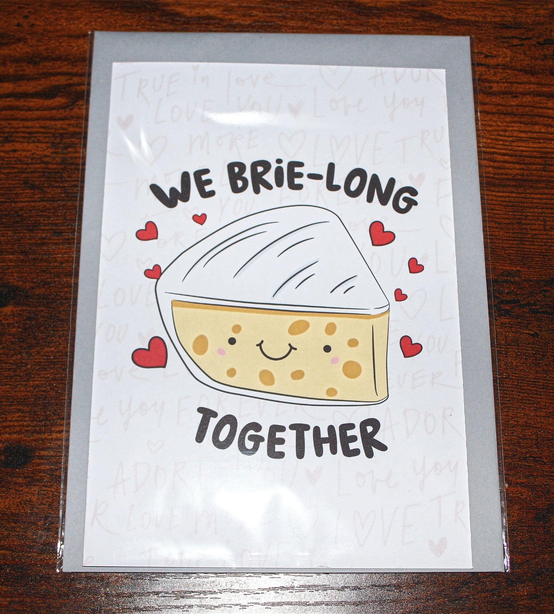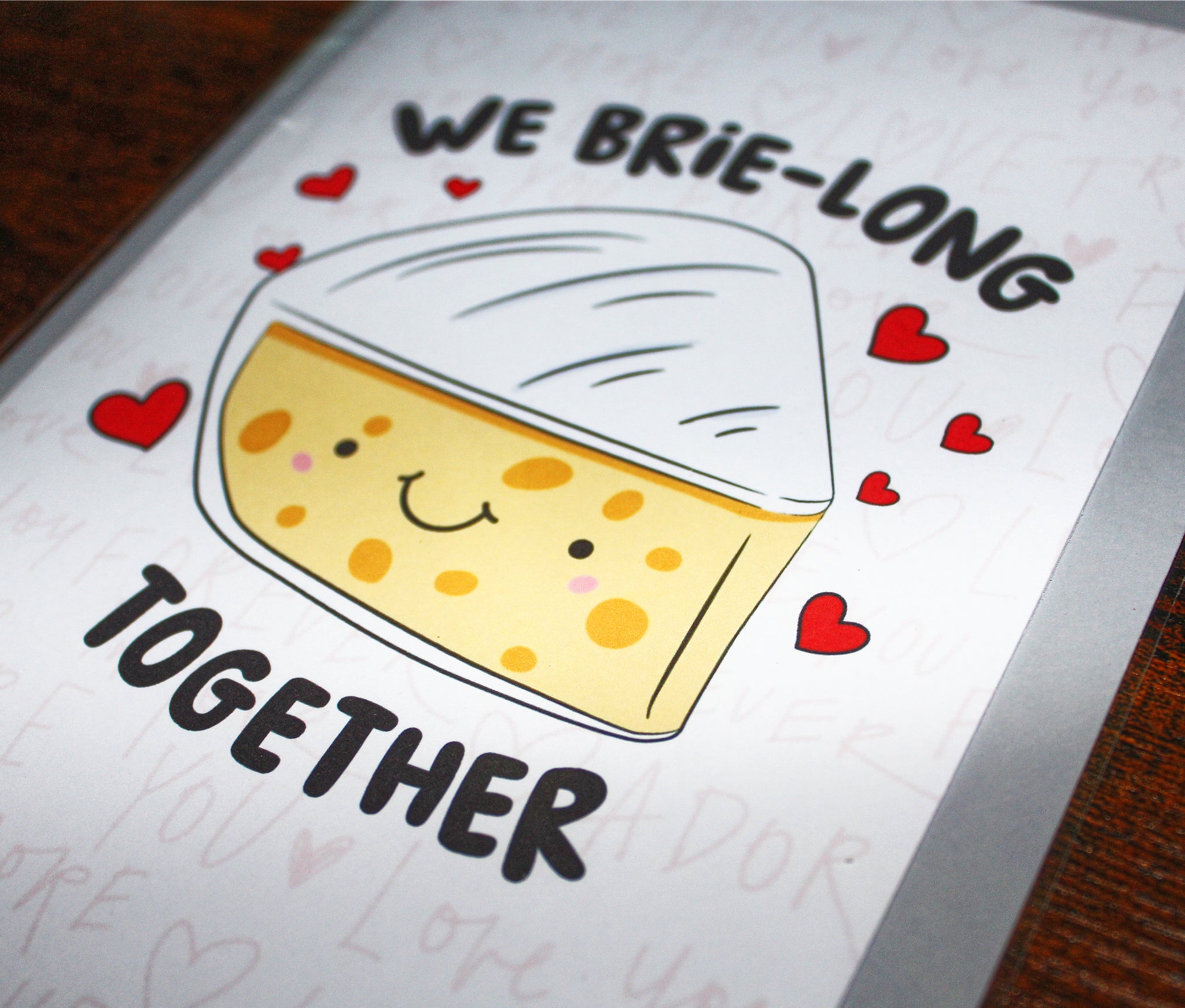 • Card with a cartoon brie cheese and text 'We brie-long together' on a wooden surface