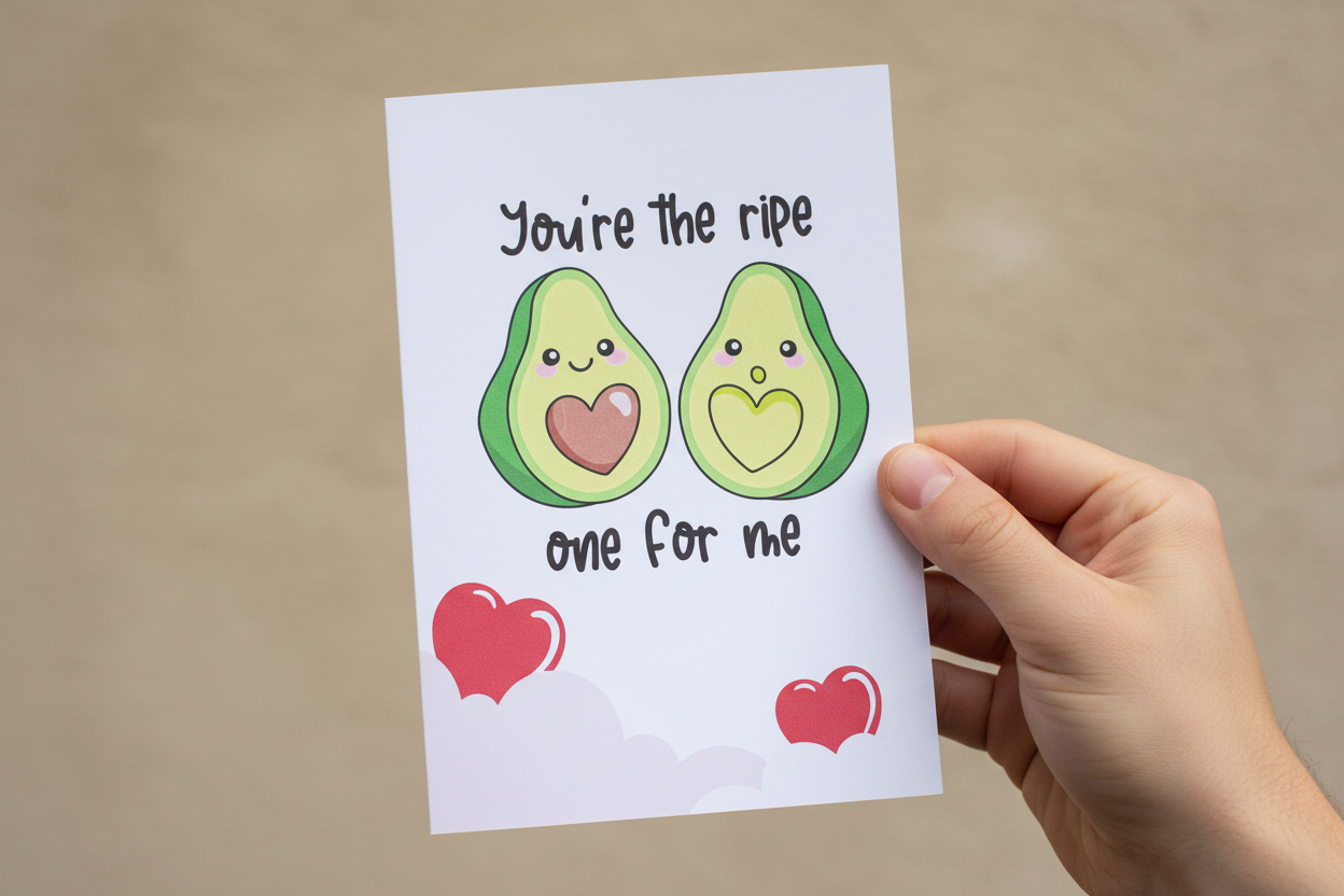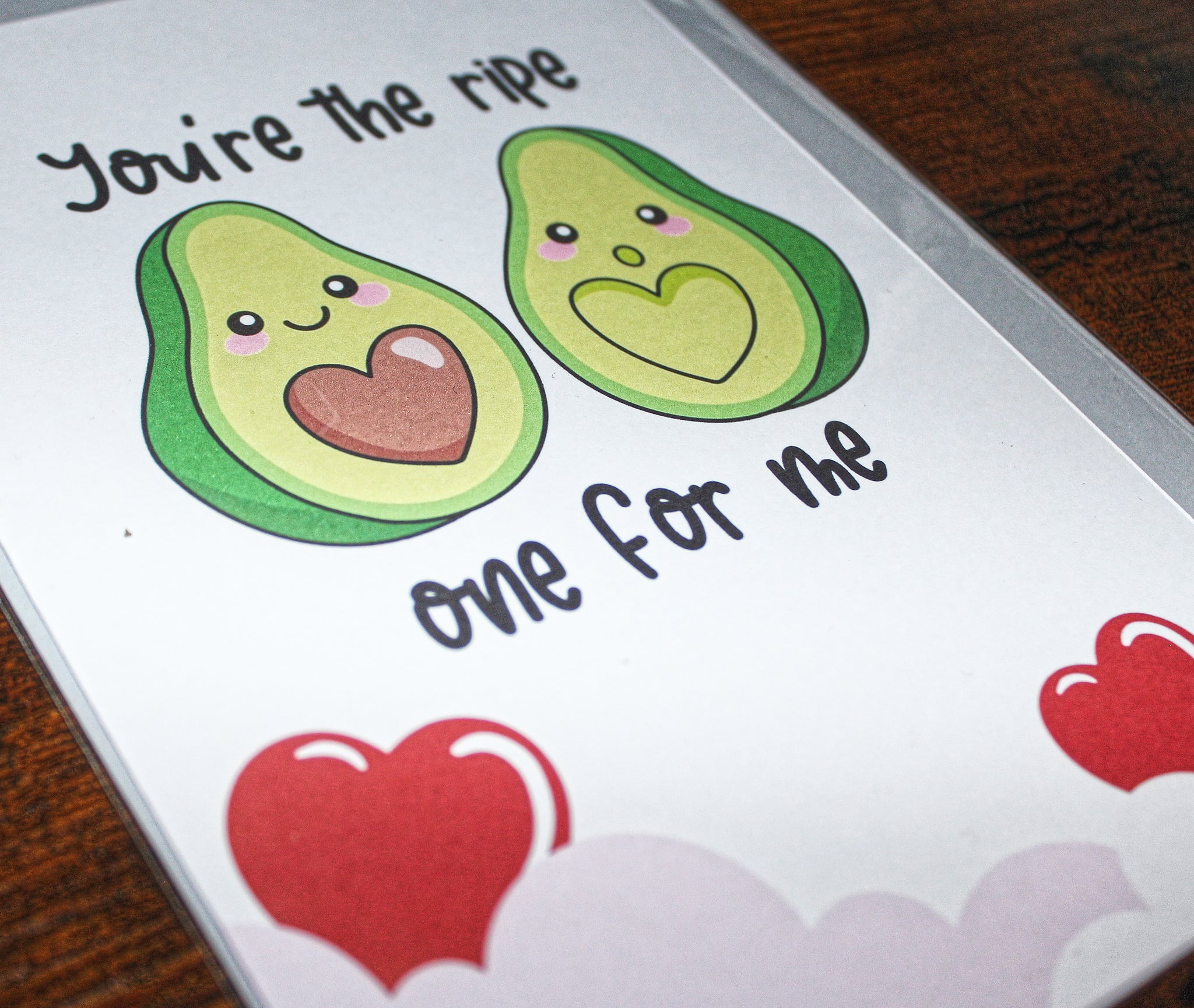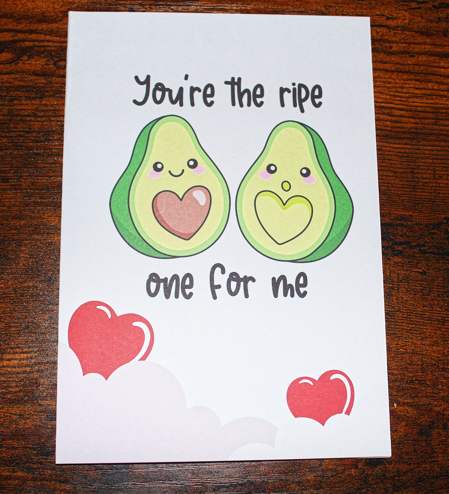 • Card with cartoon avocados and text 'You're the ripe one for me' on a wooden surface