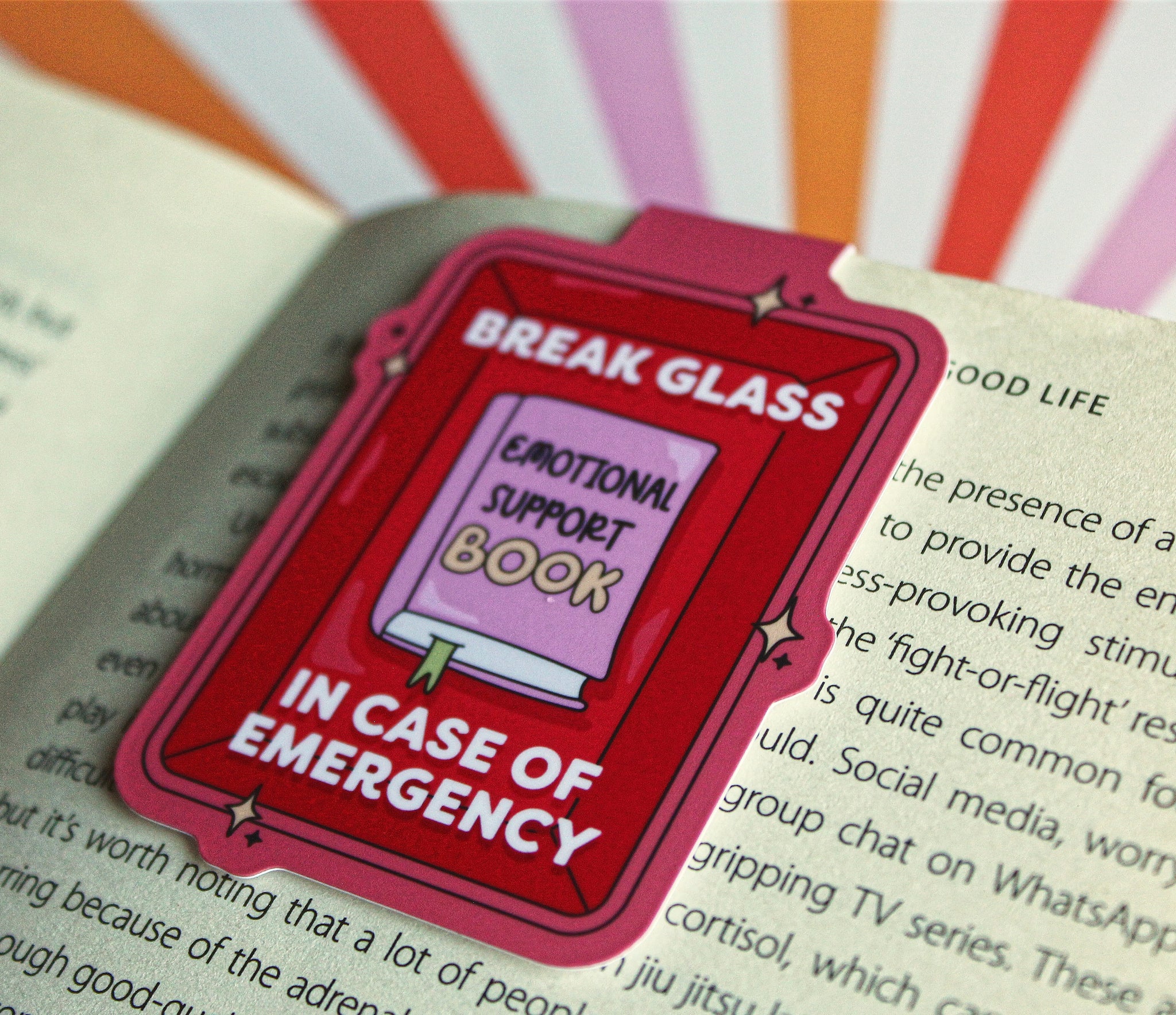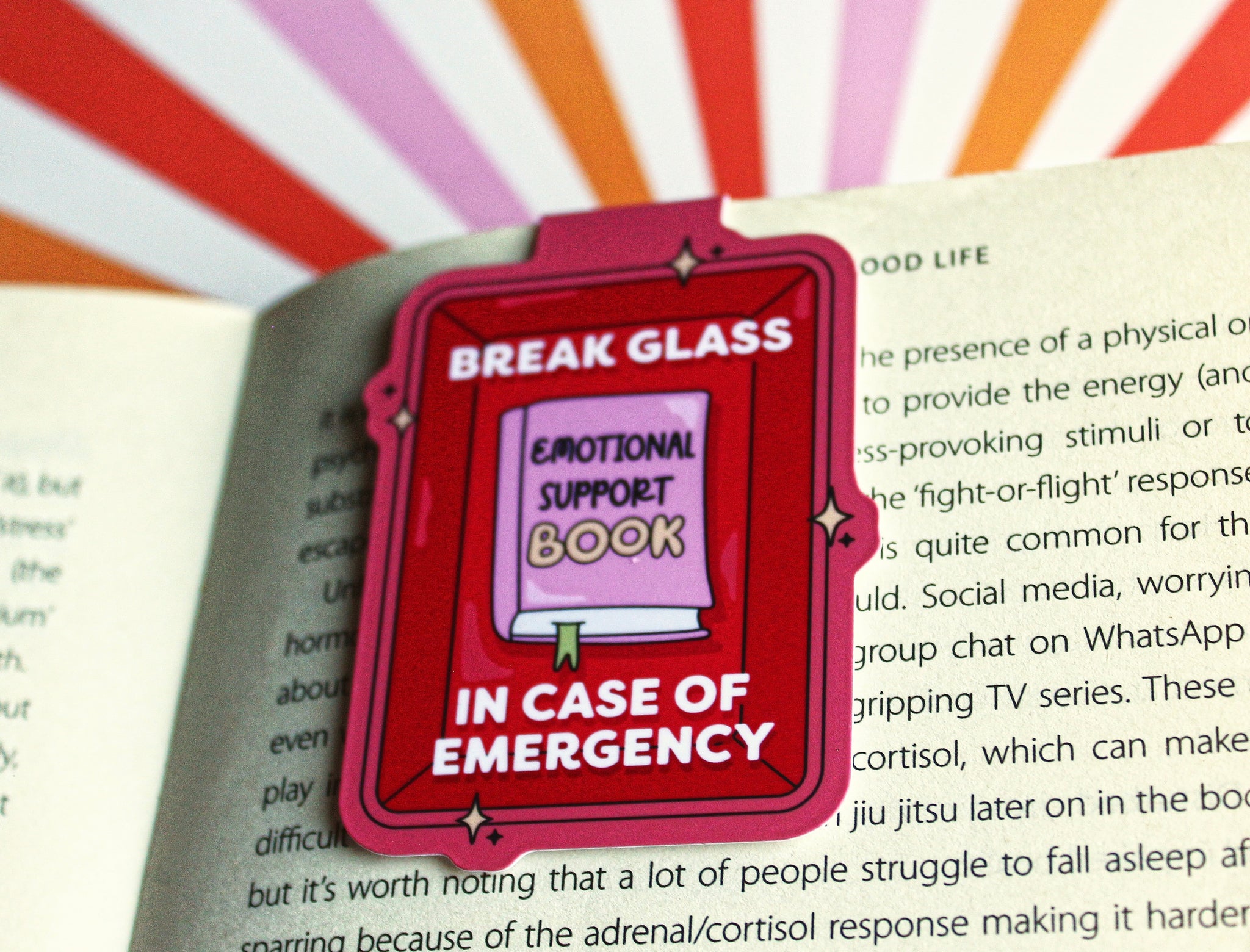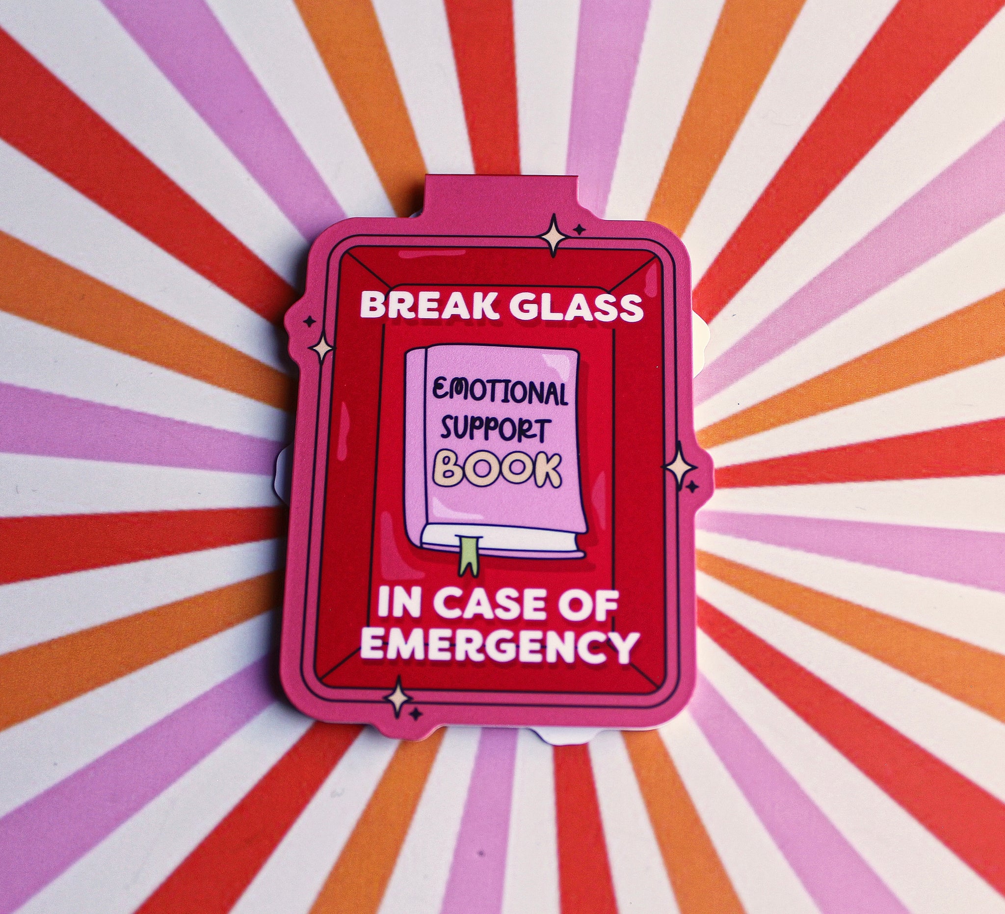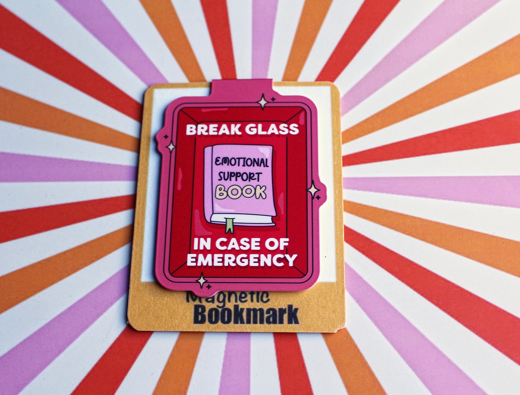• Magnetic bookmark with 'Break Glass Emotional Support Book' design on a colorful striped background