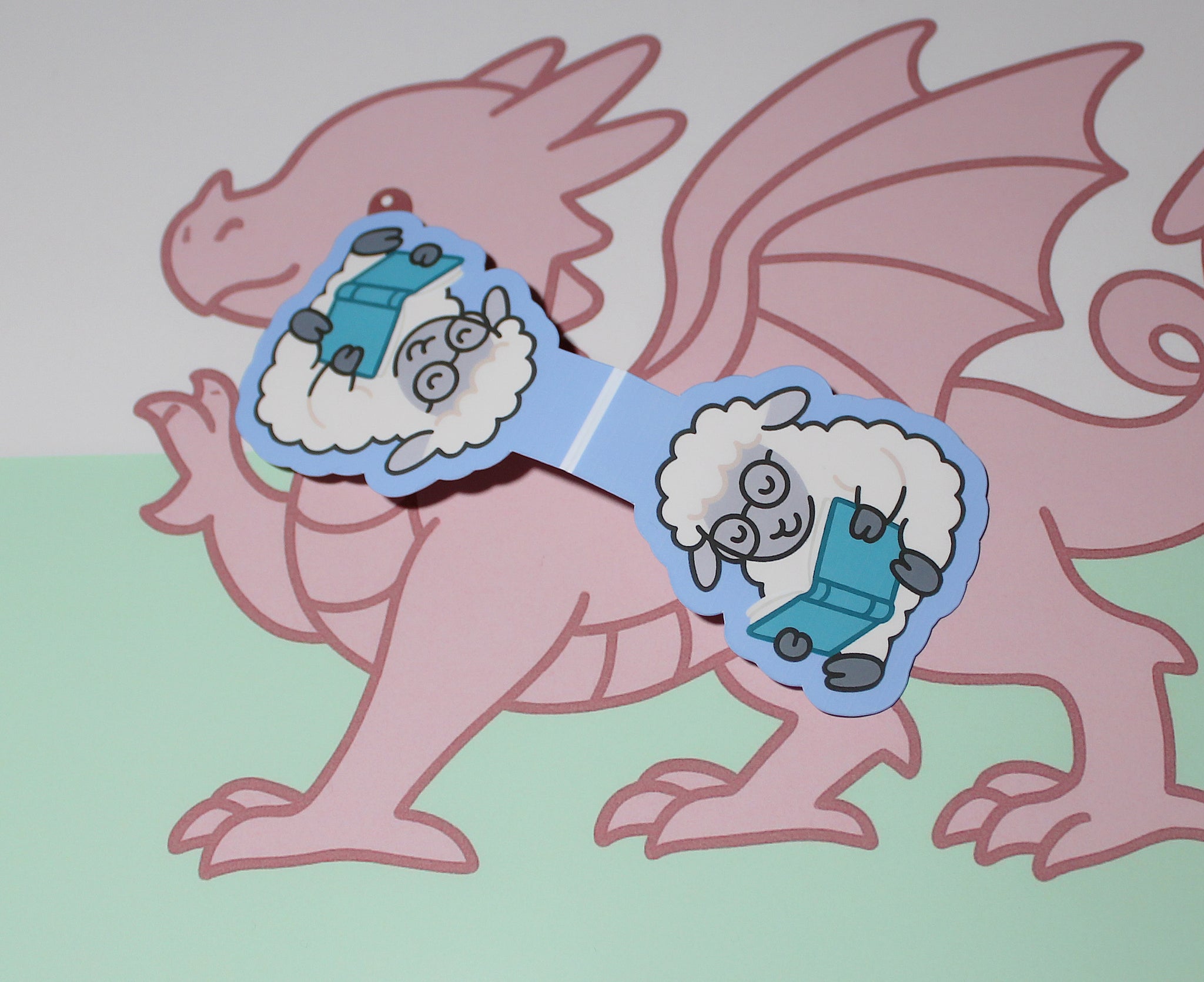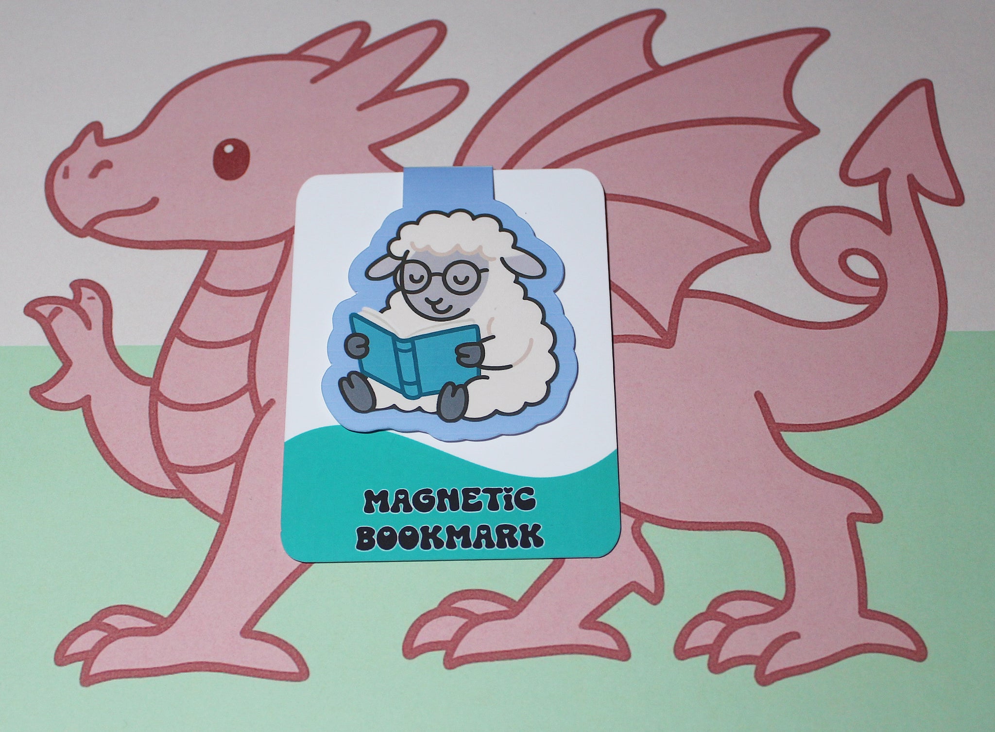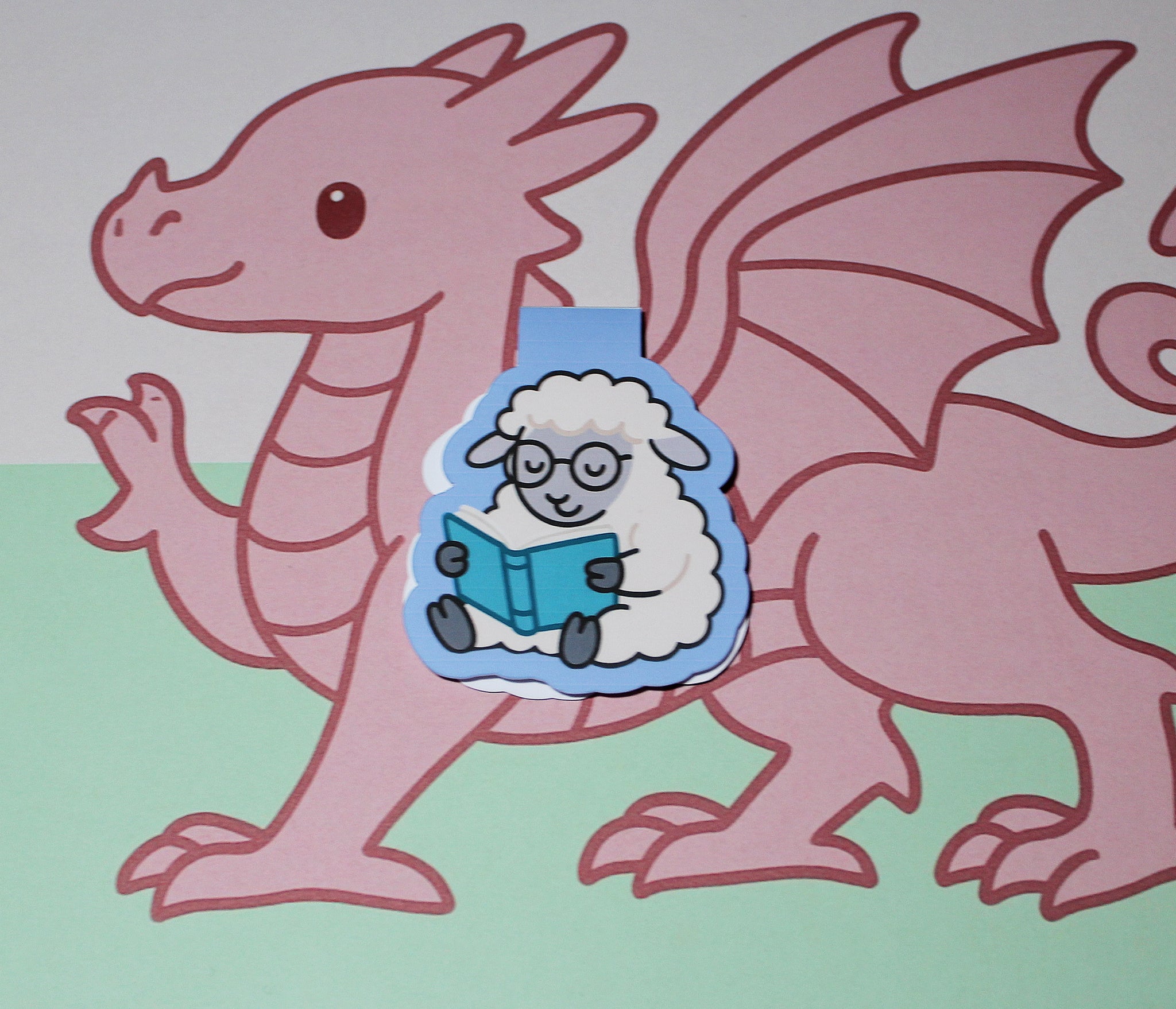 • Magnetic bookmark with cartoon sheep reading a book, held by a pink dragon on a light green background