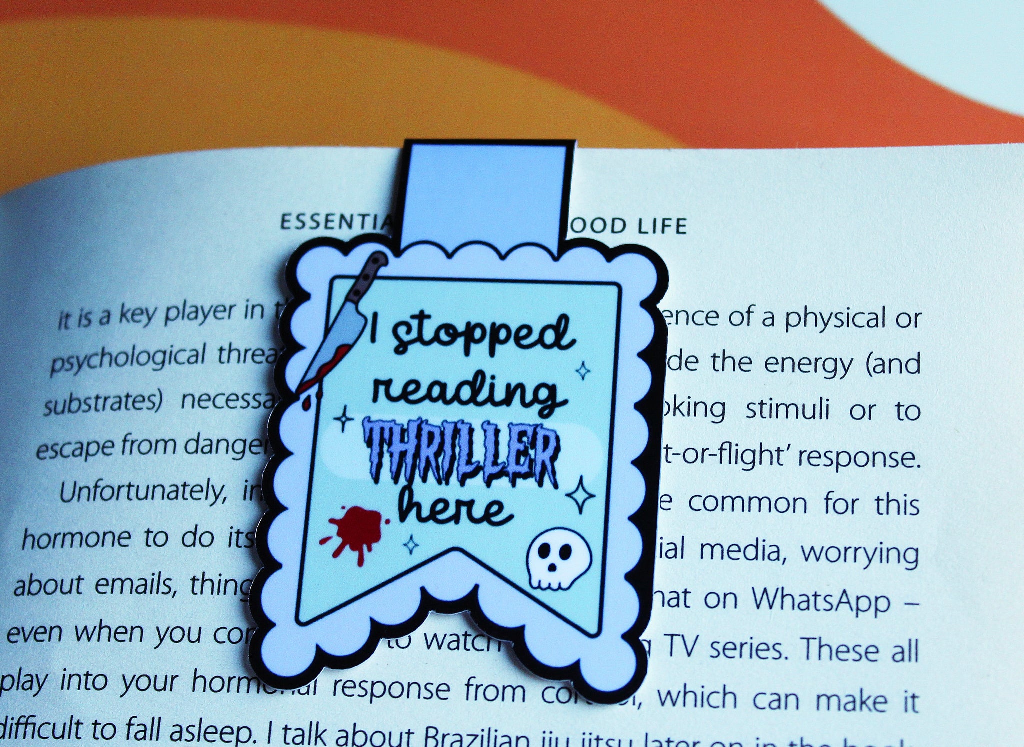 This “I Stopped Reading Thriller Here” magnetic bookmark is the perfect mix of creepy and cute! Designed with a glossy laminated finish and sturdy magnets, it keeps your page safe while adding a fun, bookish touch to your latest suspense read.