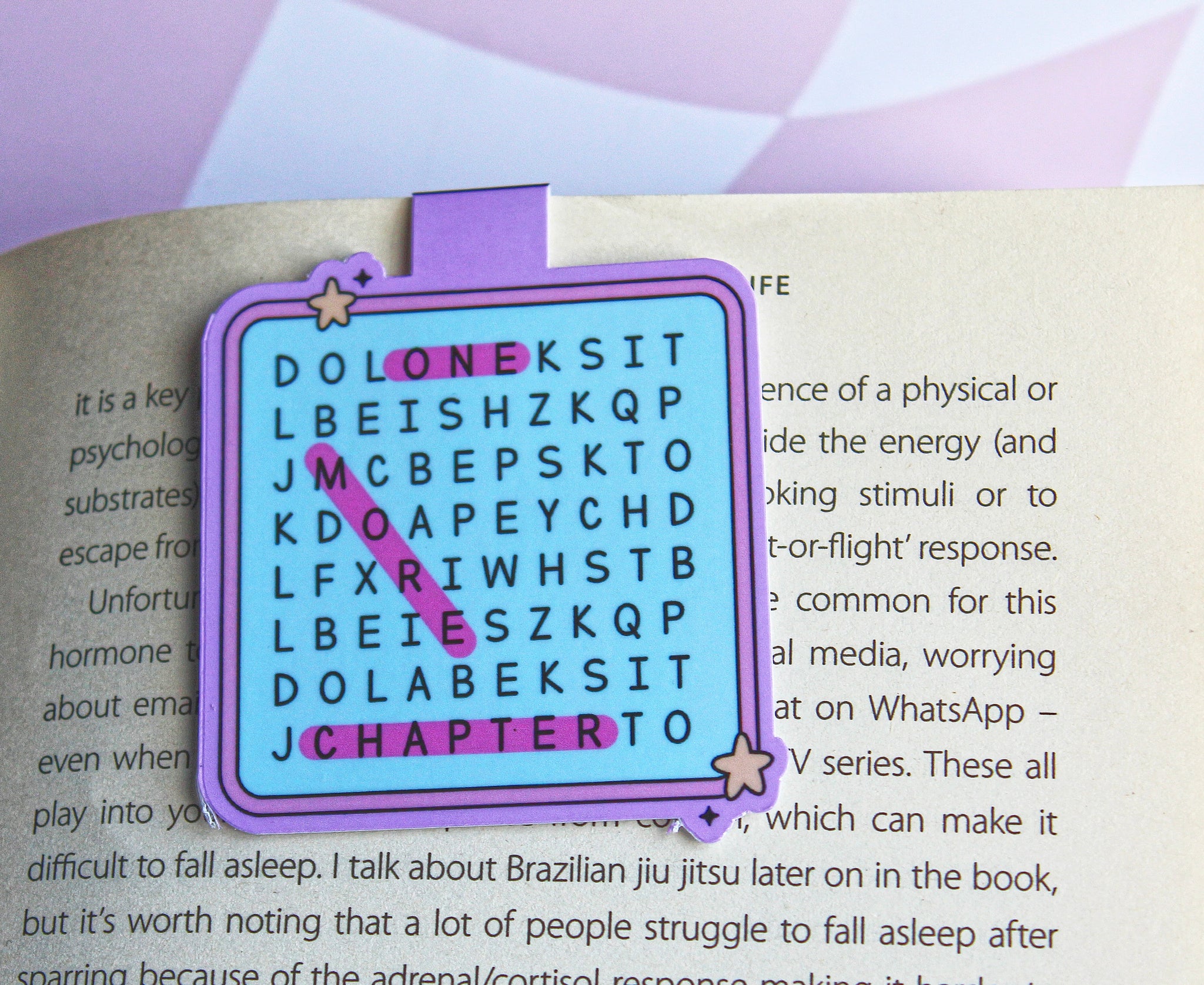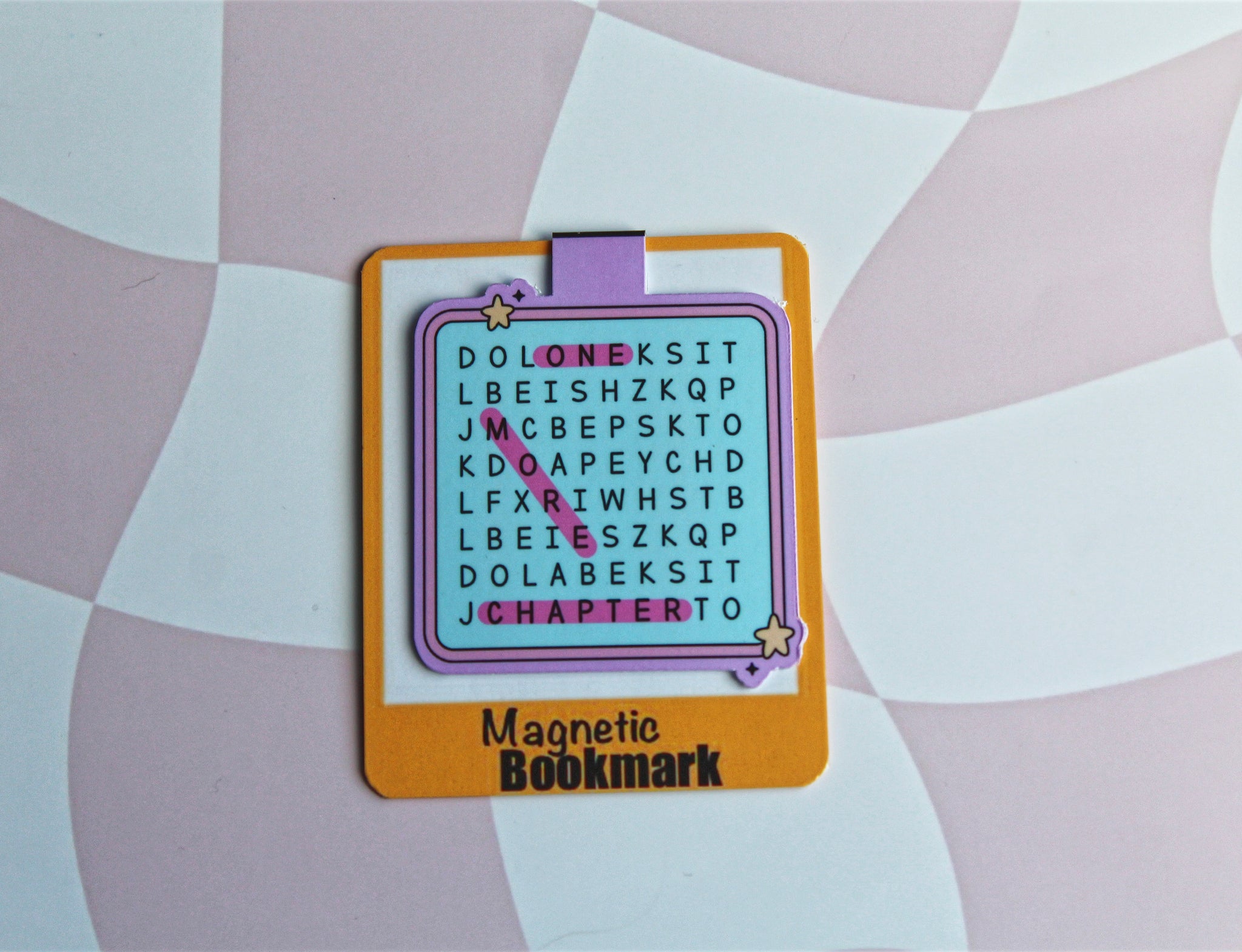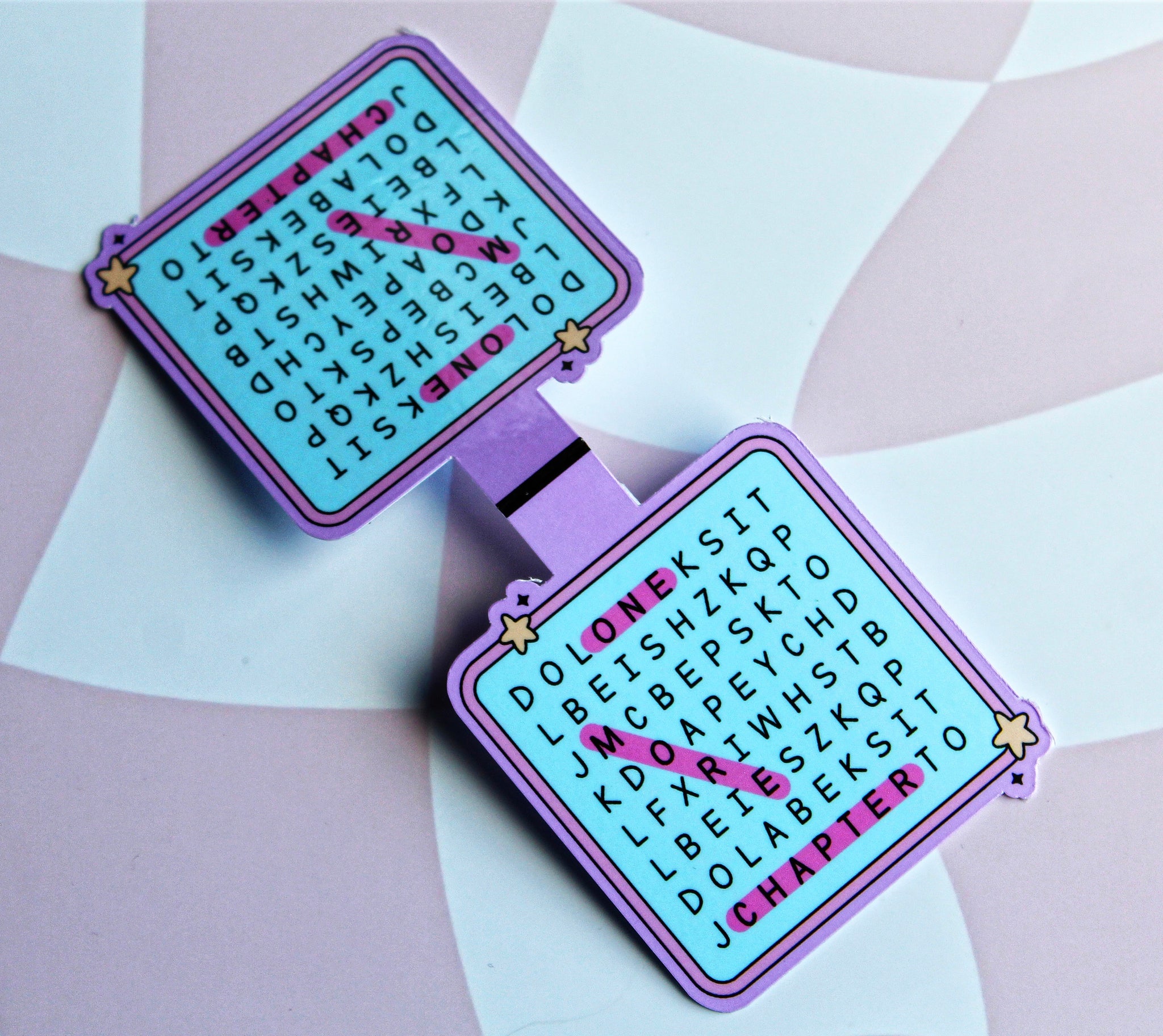 Our One More Chapter magnetic bookmark features a pastel word search puzzle with the hidden message highlighted — the perfect mix of cute and clever.