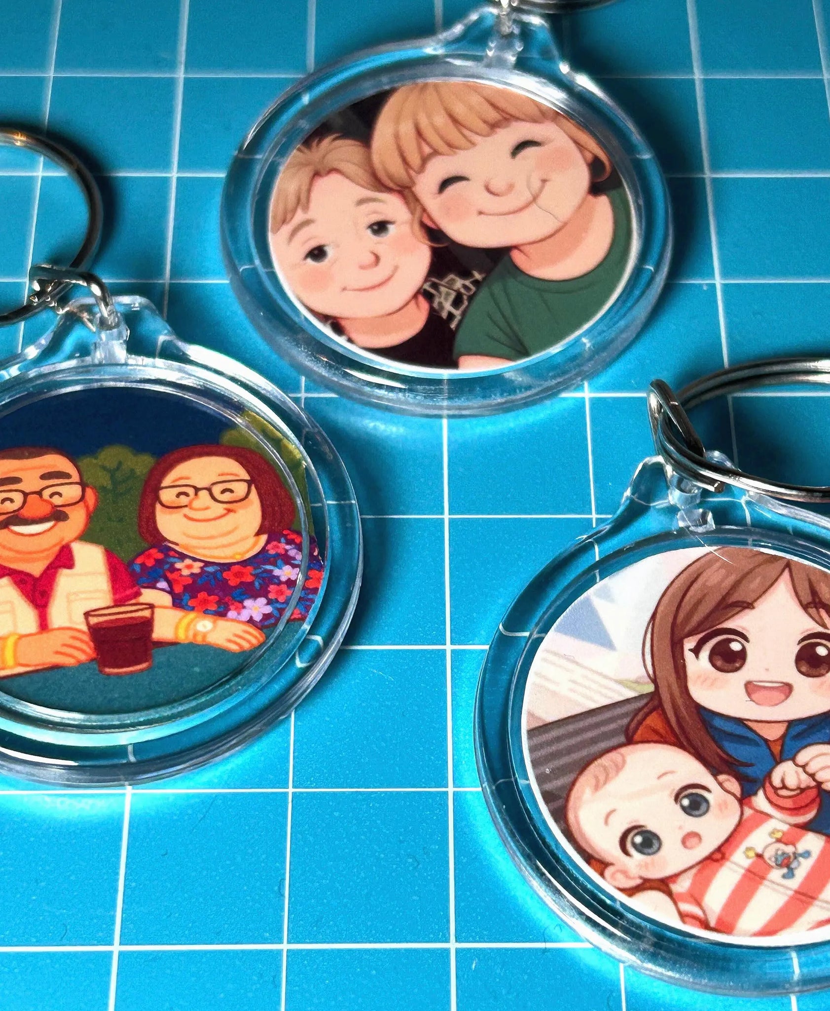we’ll transform your image into a cute cartoon design and print it as a Vinyl Keyring. Perfect for decorate your keys with a personal touch, or even as a thoughtful gift.