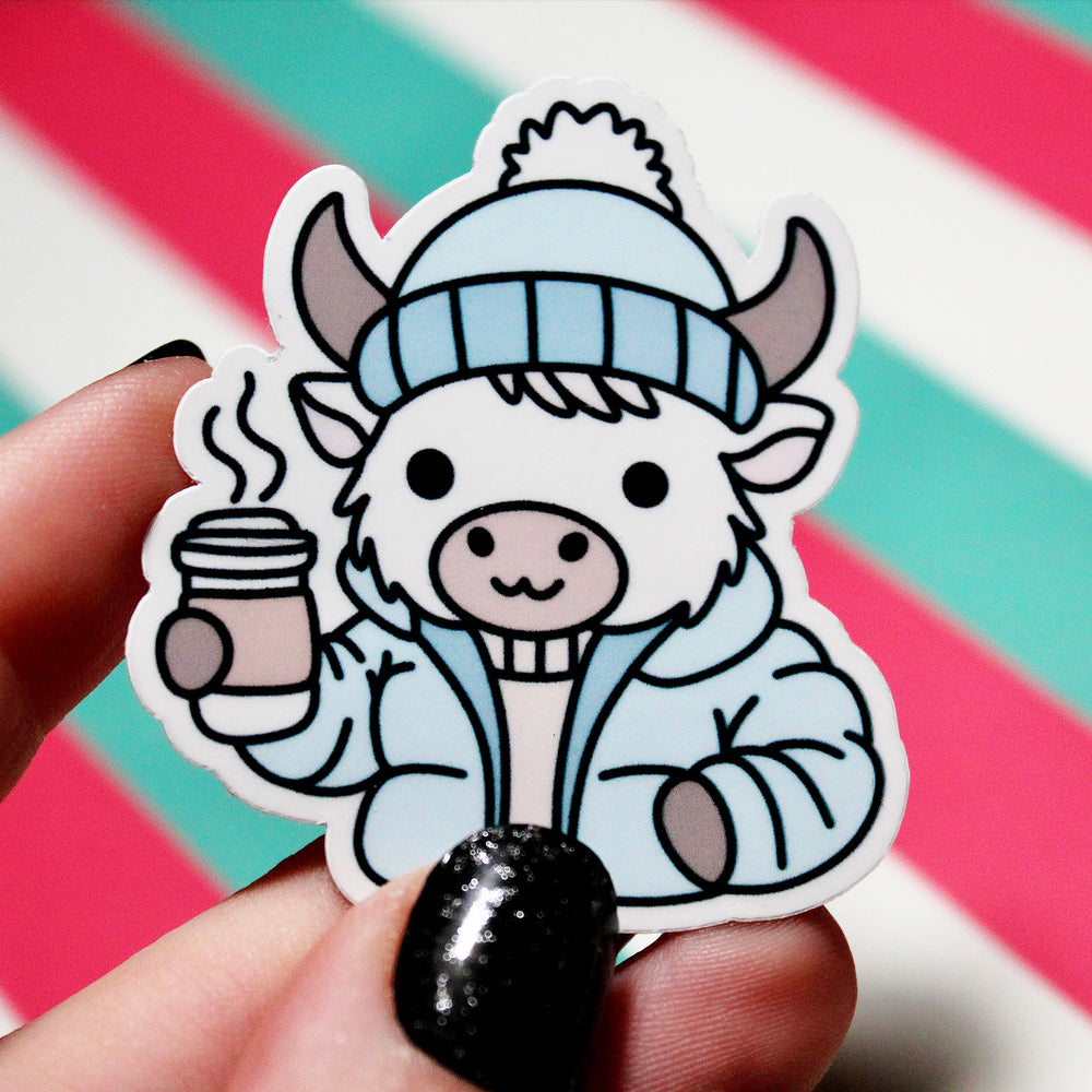Cozy Winter Cow Blue Coat Sticker – Cute Highland Cow Vinyl Sticker – Hot Drink Cow – Glossy Waterproof Sticker – Winter Aesthetic – 4.5cm x 4.99cm