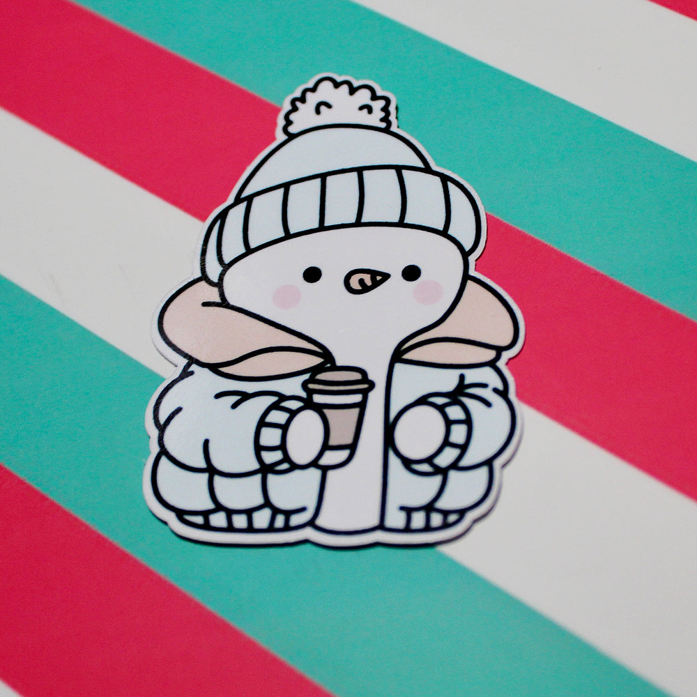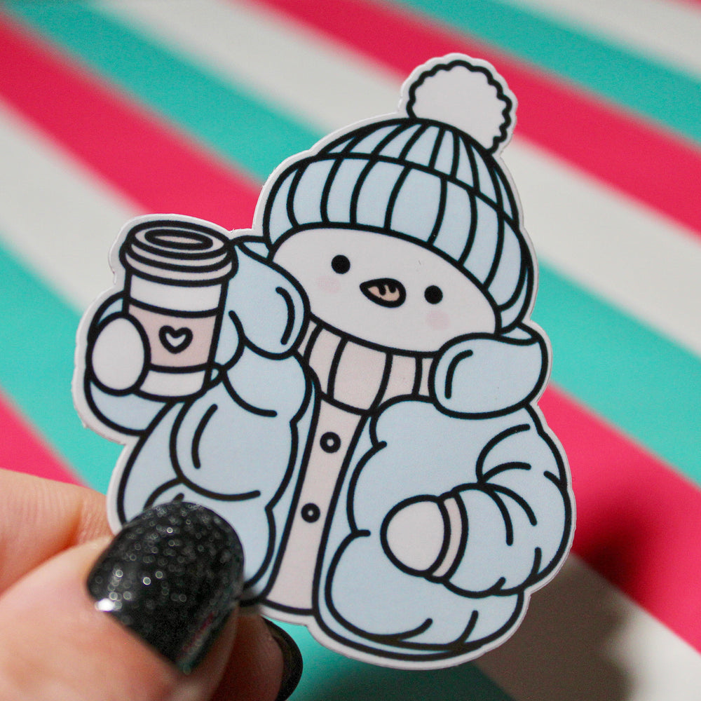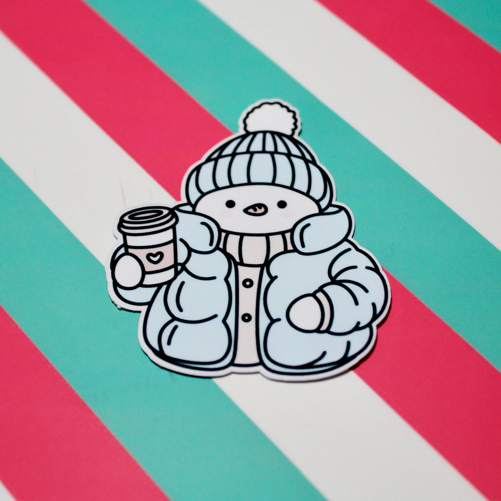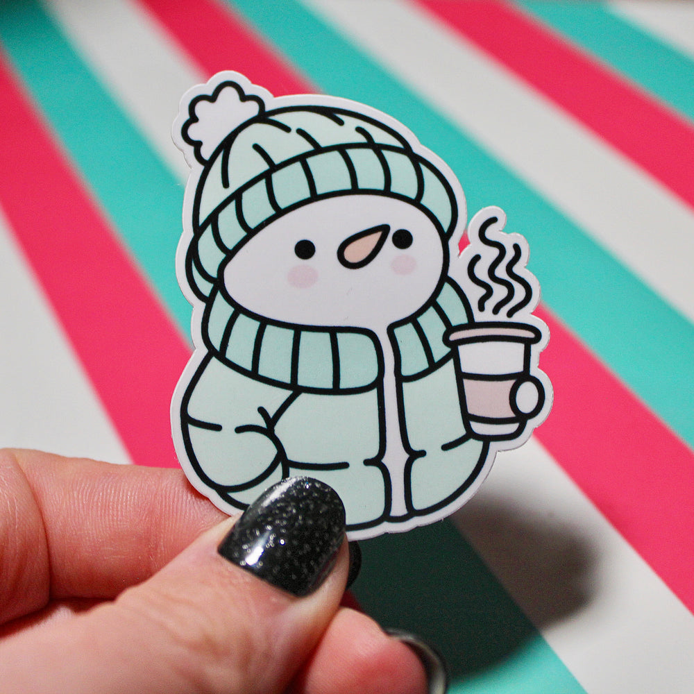 Cozy Winter Snowman Blue Coat Sticker – Cute Snowman Vinyl Sticker – Hot Drink Snowman – Glossy Waterproof Sticker – Winter Aesthetic – 5.02cm x 5.99cm