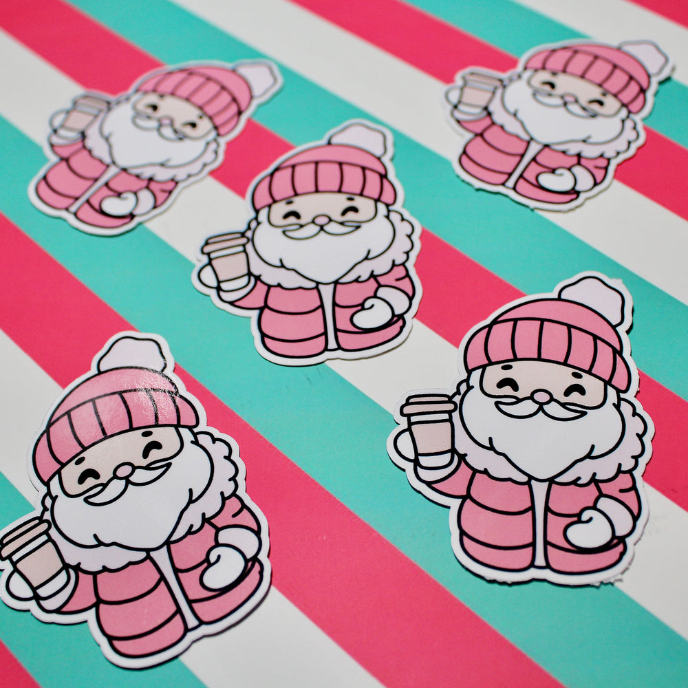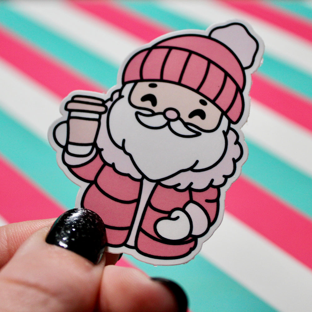 Red Cozy Santa Sticker – Cute Christmas Santa Vinyl Sticker – Hot Drink Santa – Glossy Waterproof Sticker – Festive Aesthetic – 4.67cm x 6.32cm
