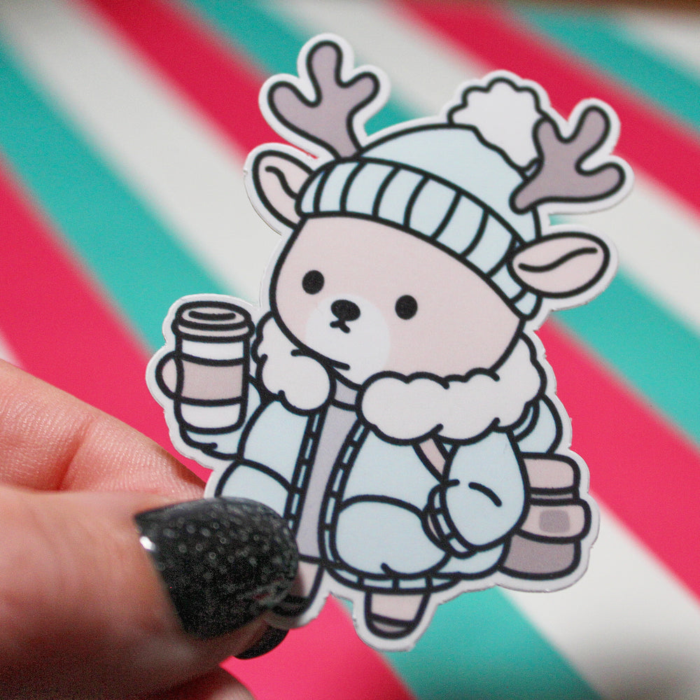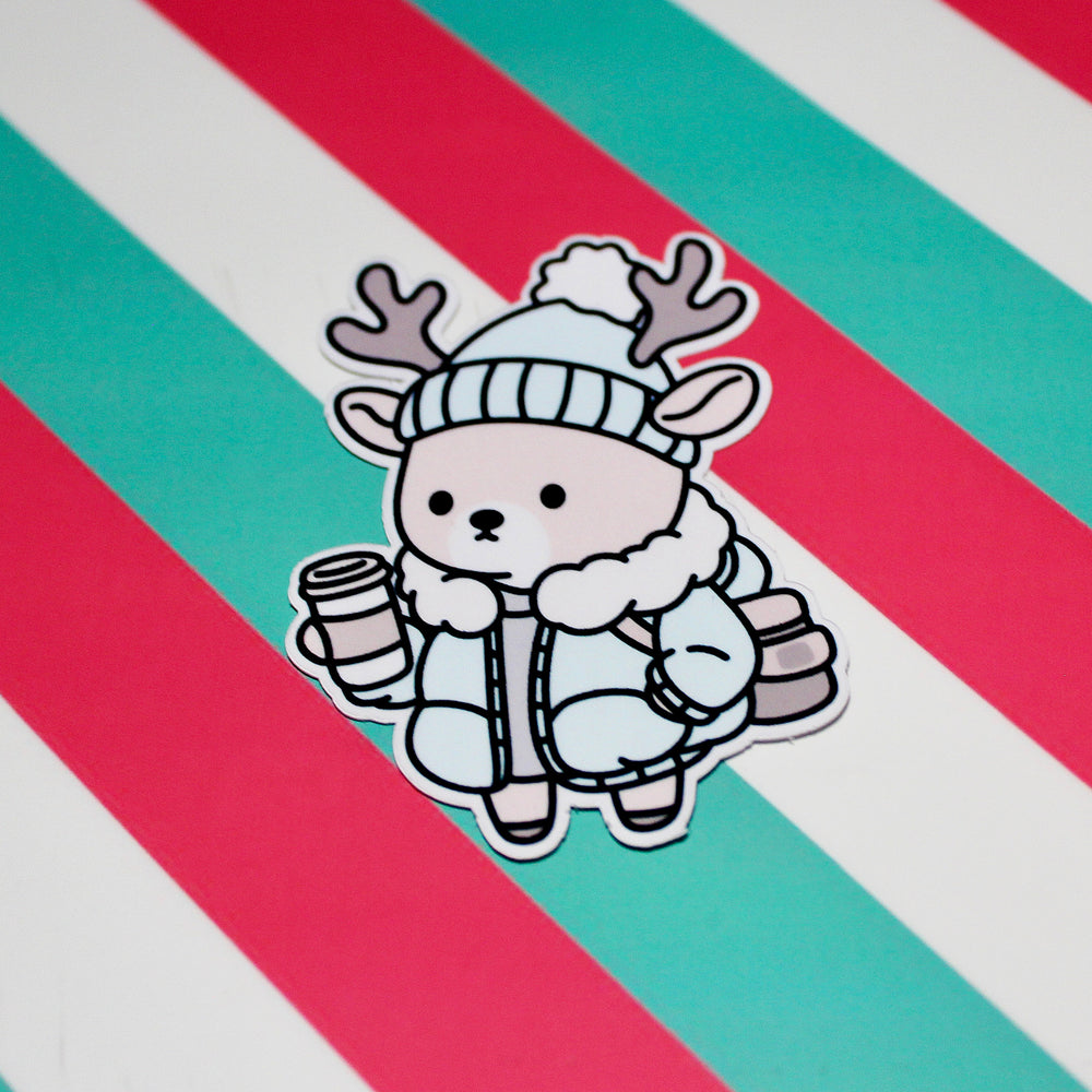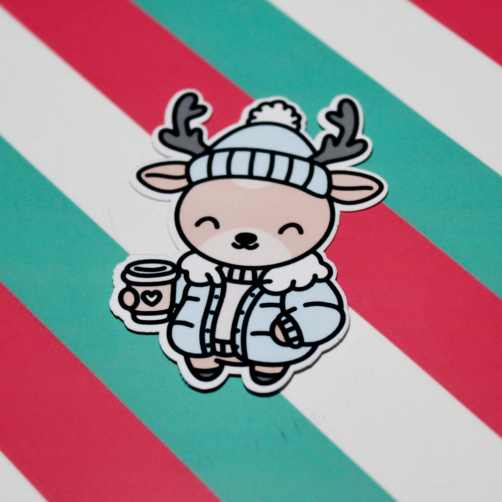 Cosy Winter Reindeer Sticker – Cute Pastel Aesthetic | Hot Drink Christmas Sticker | Waterproof Gloss Vinyl | 4.41cm x 5.98cm