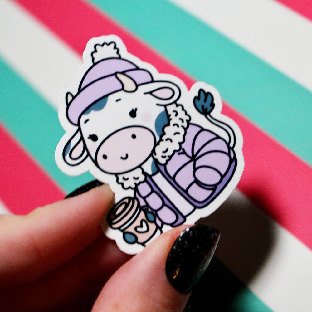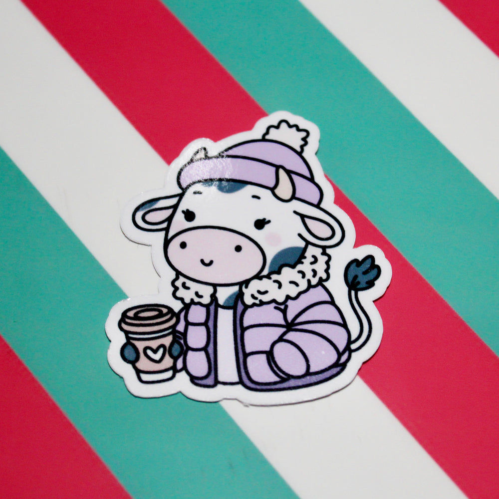 Winter Cow Pink Coat Sticker – Cute Cozy Cow Vinyl Sticker – Hot Chocolate Cow – Glossy Water-resistant Sticker – Winter Aesthetic Sticker – 4.33cm x 4.94cm