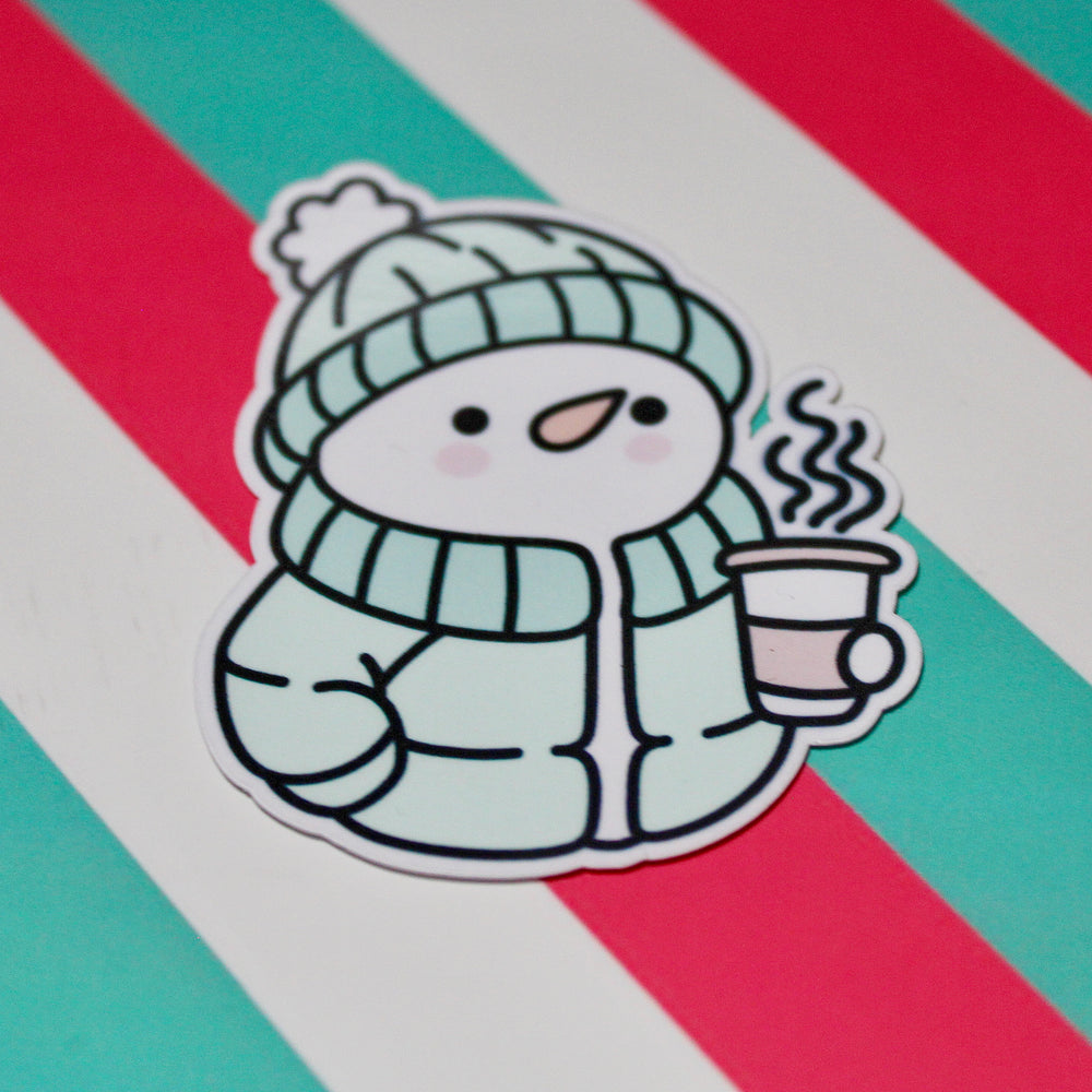 Cozy Snowman Green Coat Sticker – Cute Winter Snowman Vinyl Sticker – Hot Drink Snowman – Glossy Waterproof Sticker – Christmas Sticker – 4.75cm x 5.99cm