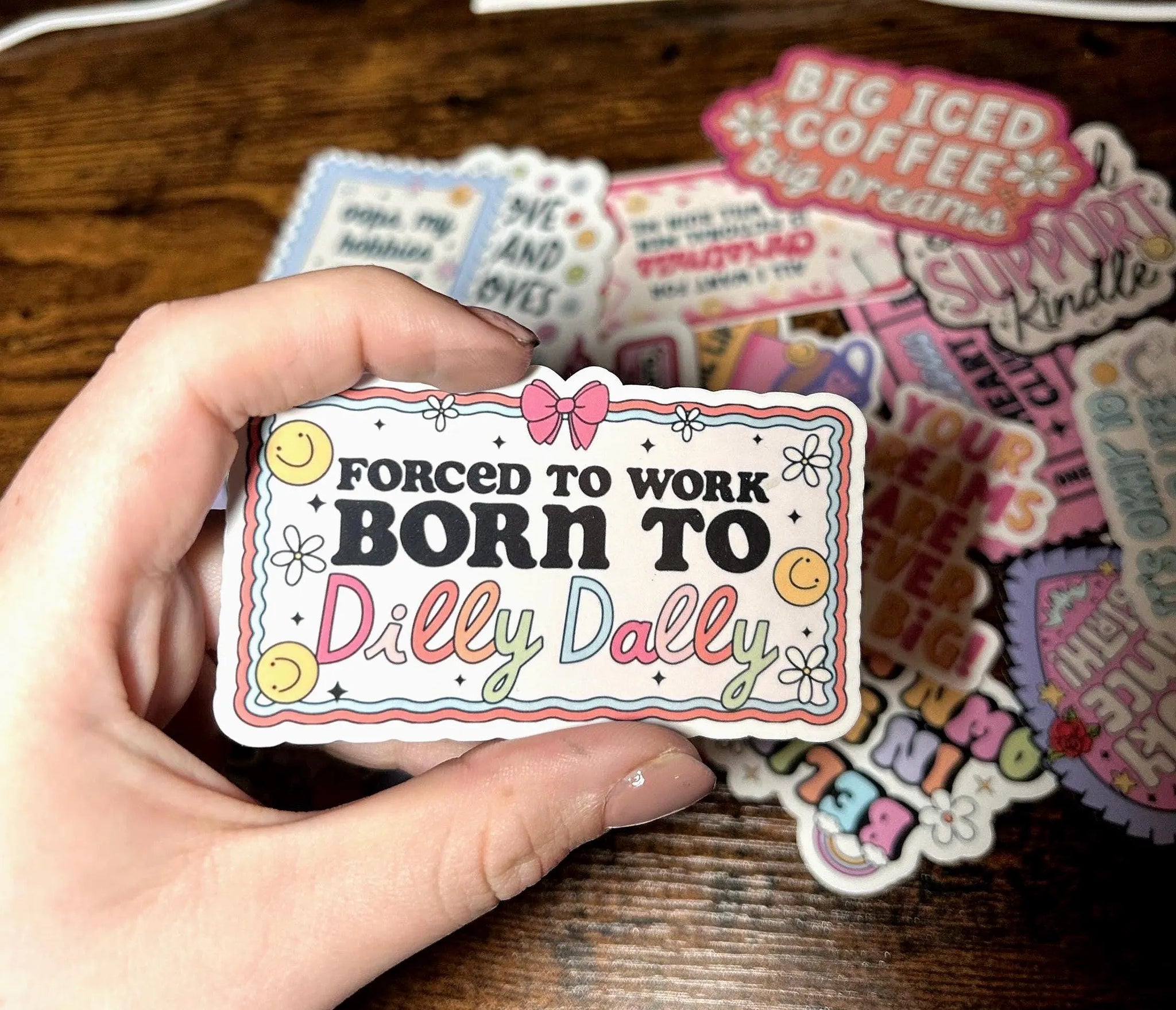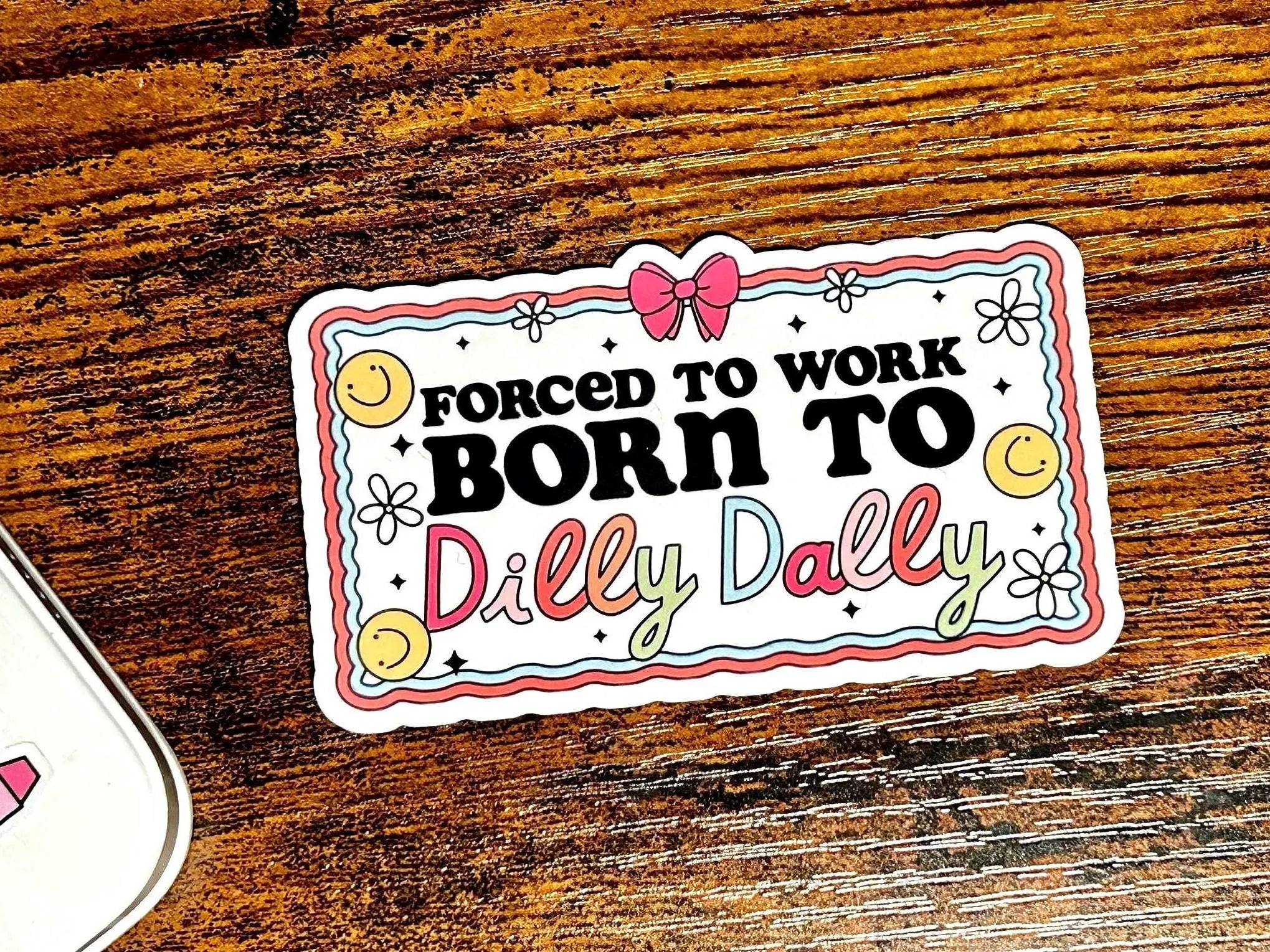 Add a little humour and retro charm to your day with this “Forced to Work, Born to Dilly Dally” sticker — perfect for anyone who’d rather be daydreaming than working! ☀️