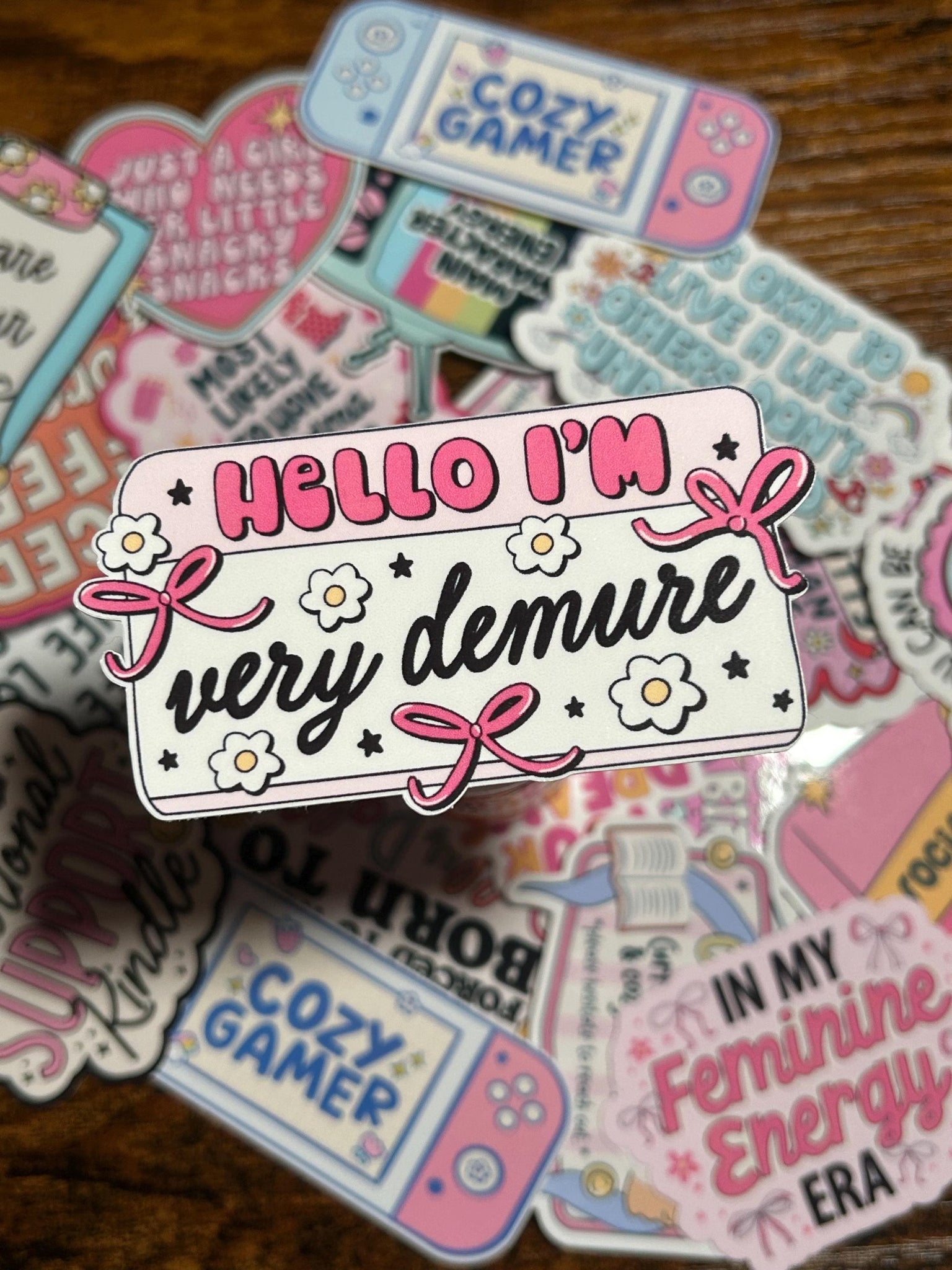 • Sticker with 'Hello I'm very demure' text held by a hand against a colorful background.