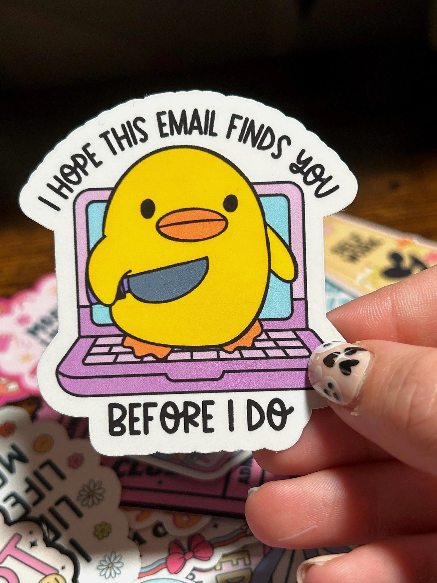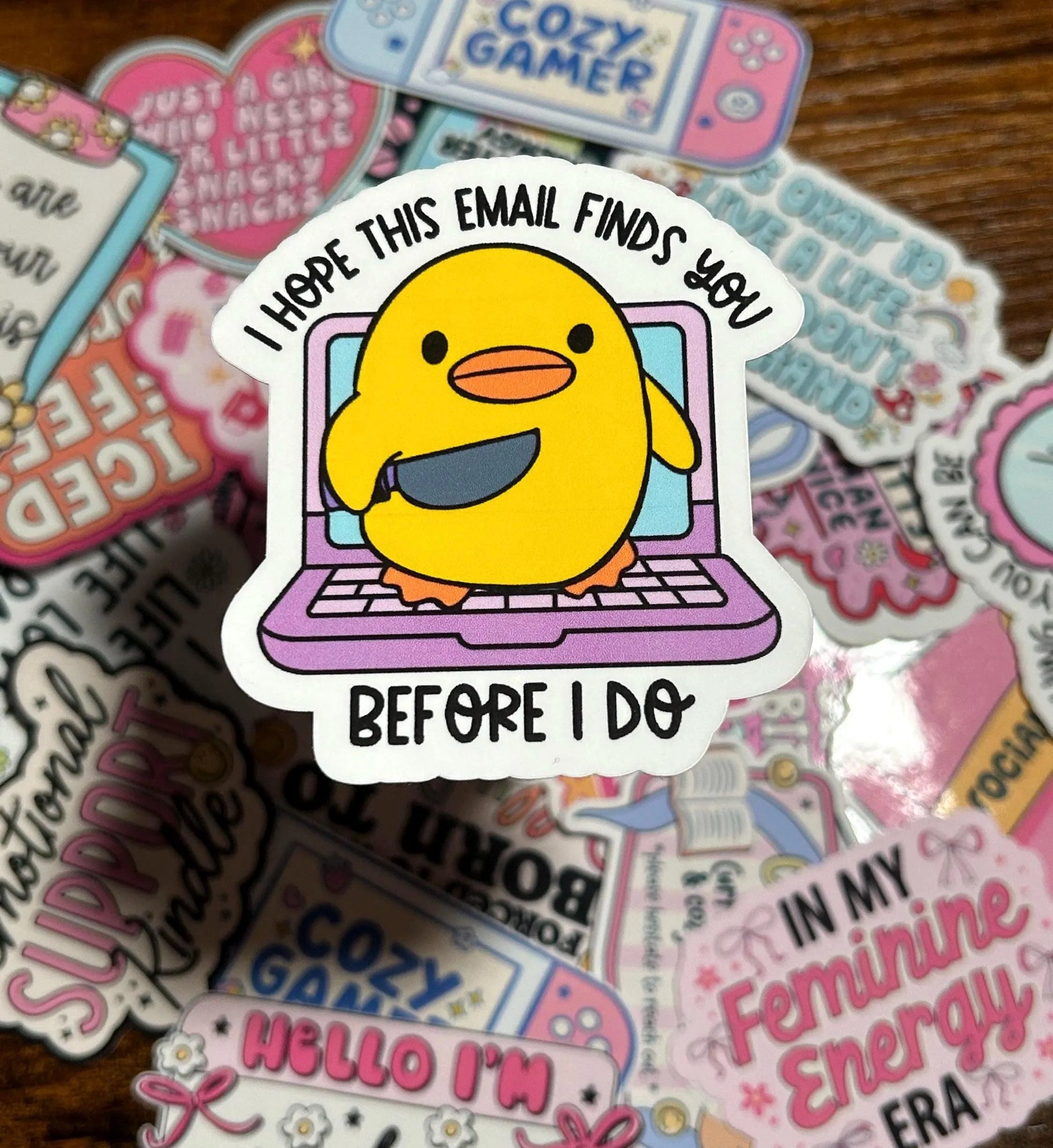 Featuring a cute yellow duck on a pastel laptop, this glossy vinyl sticker perfectly captures that relatable email rage moment we all know too well.