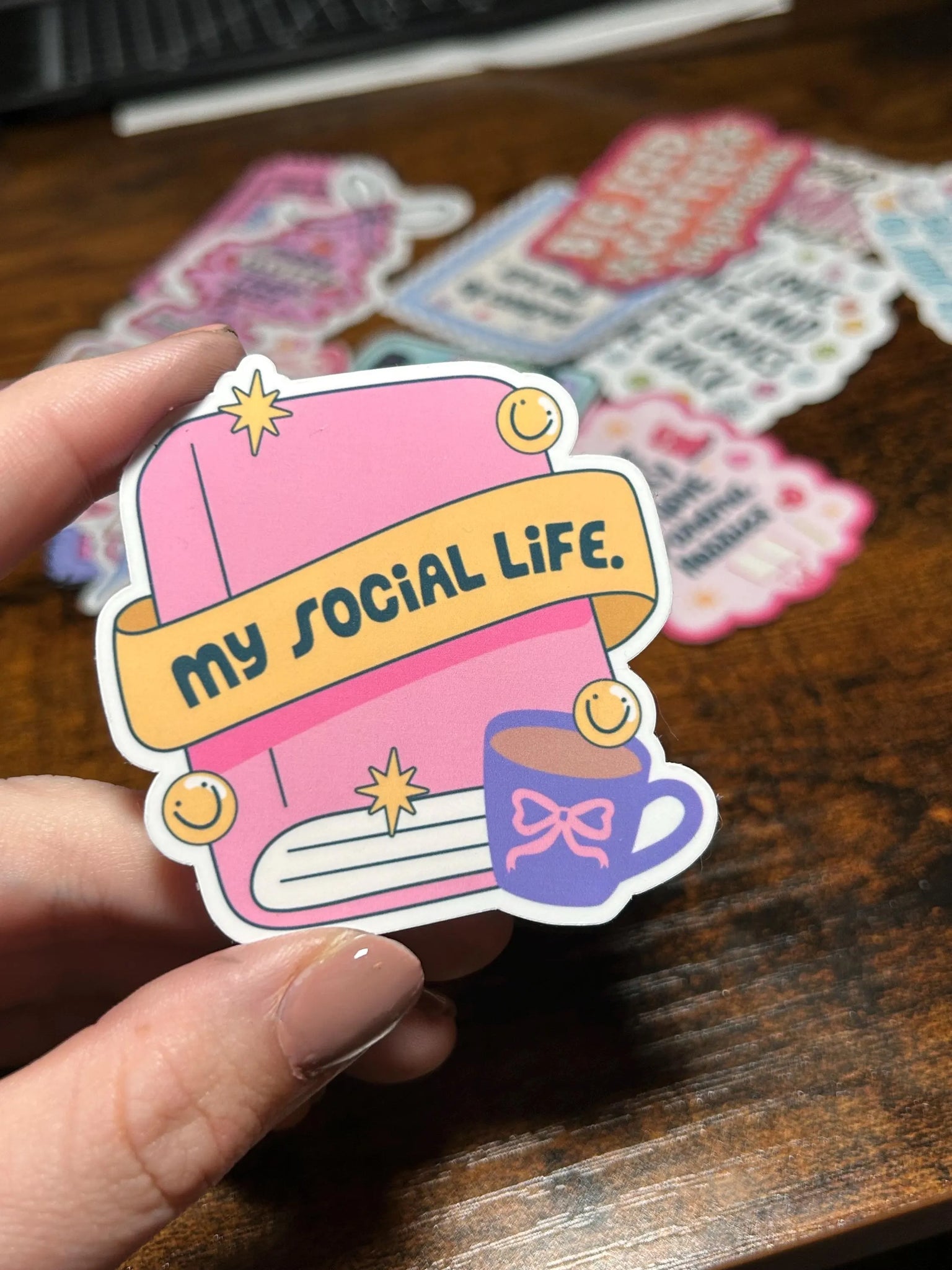 • Sticker with 'my social life' text held by a hand on a wooden surface