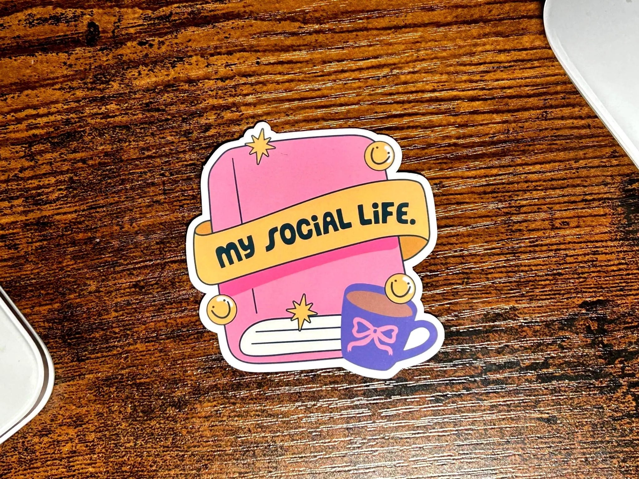• Sticker with 'My Social Life' design on a wooden surface