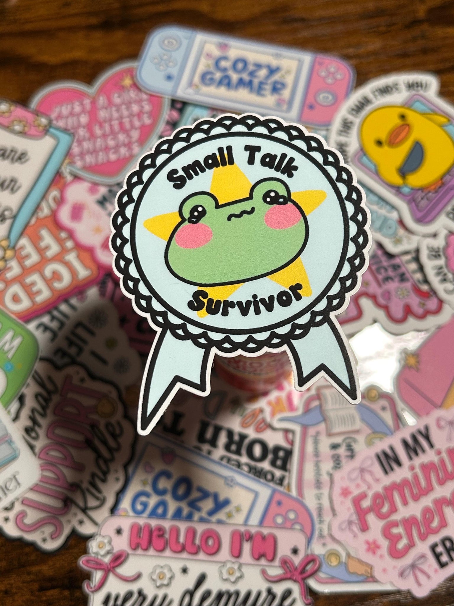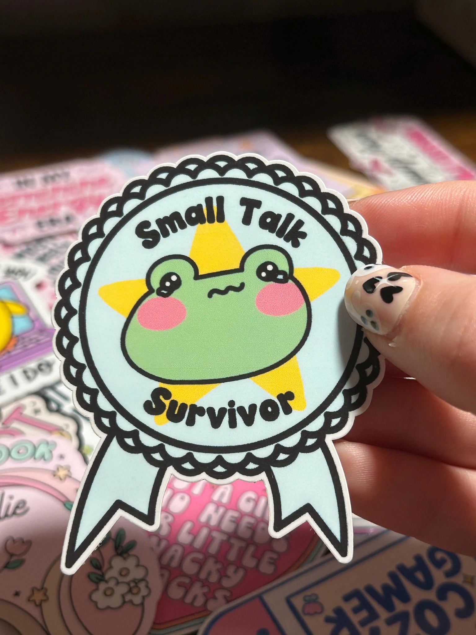 your quiet confidence with this funny and relatable “Small Talk Survivor” sticker from Stick With Geo!