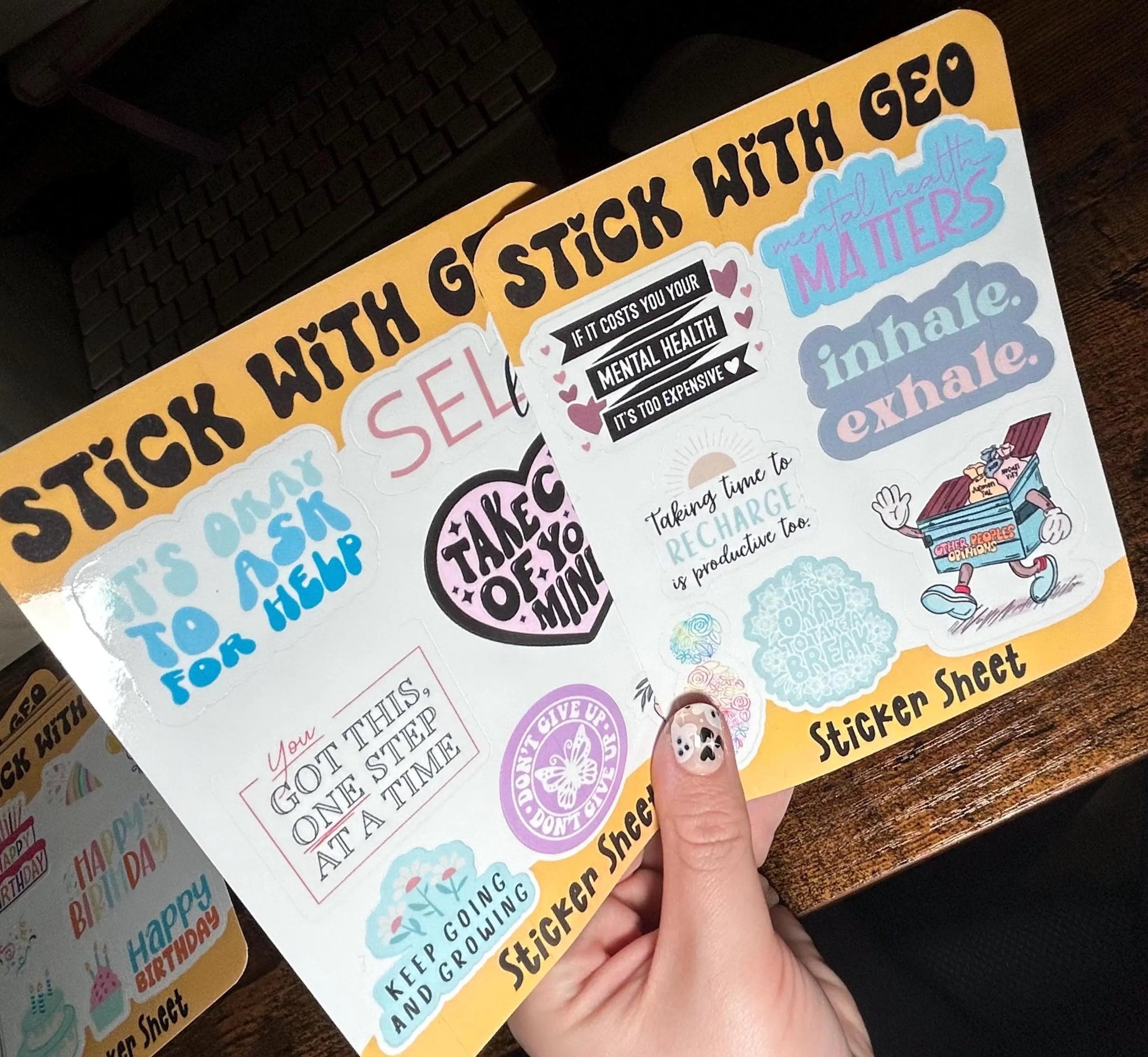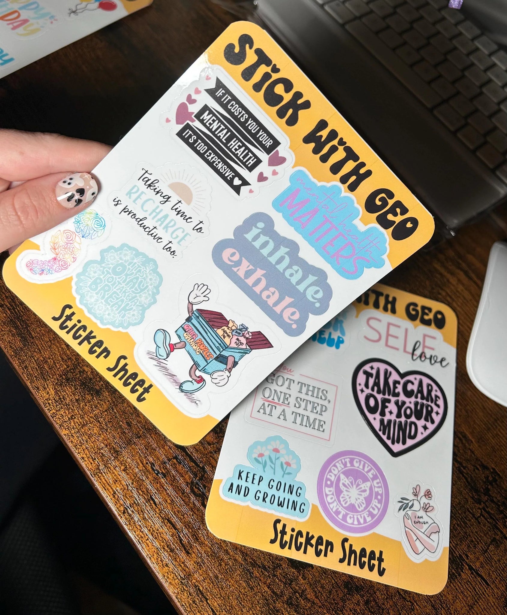 Spread positivity and gentle reminders with these mental health & self-care sticker sheets from Stick With Geo! Each 4.5” x 6” sheet is filled with inspiring affirmations and wellness designs, featuring messages like “Take Care of Your Mind”, “Inhale Exhale” and “It’s Okay to Ask for Help.”